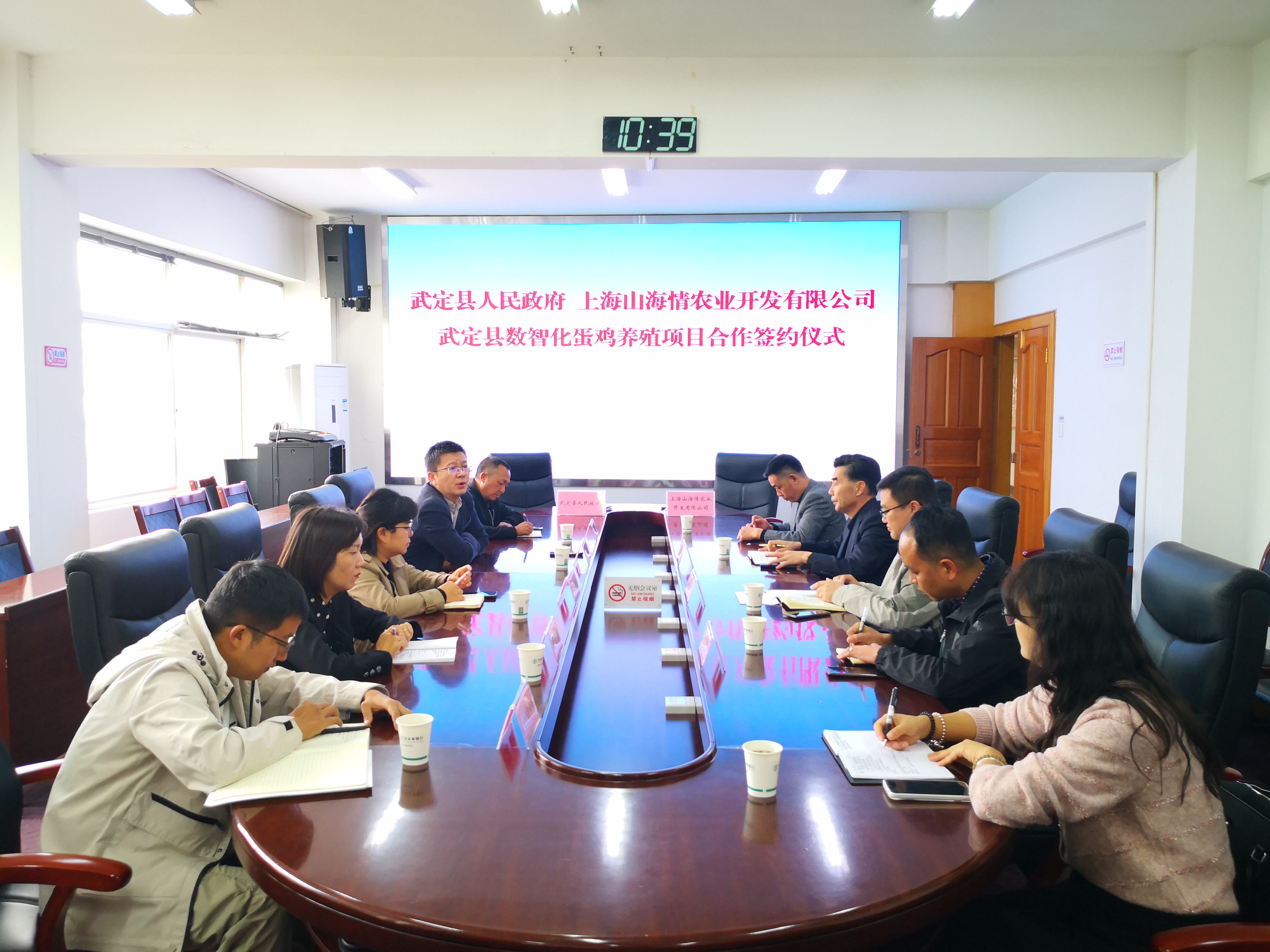 2024年10月28日,武定县人民政府与上海山海情农业开发有限公司合作的“武定县数智化蛋鸡养殖项目”签约仪式在武定县举行。武定县委常委、县人民政府副县长朱江和上海山海情农业开发有限公司总经理王泽勇共同出席签约仪式。此次签约的武定县智能化蛋鸡养殖项目,将为双方发展注入崭新机遇与强劲动力。