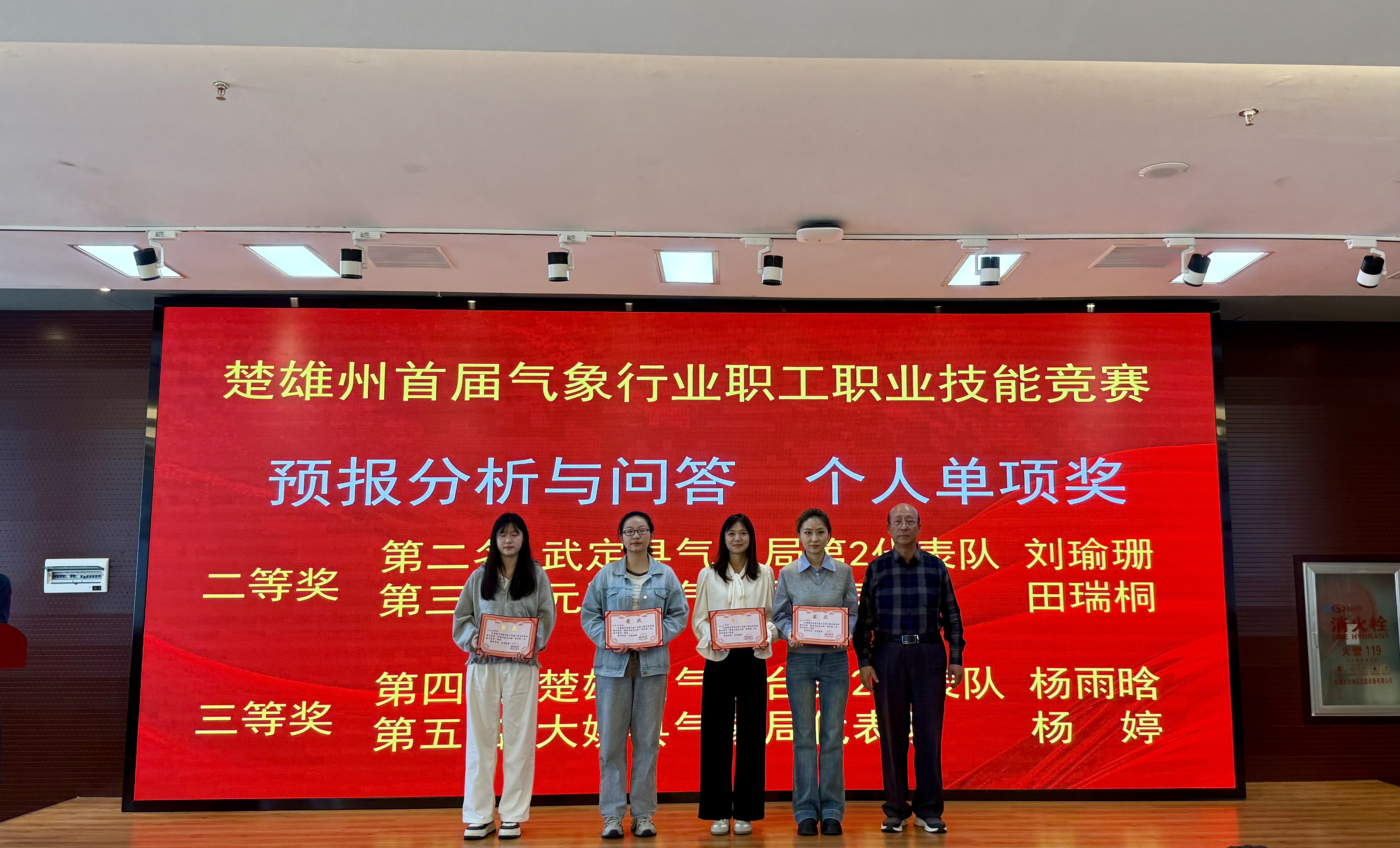 4月22日至25日经过三天激烈竞争,楚雄州首届气象行业职工职业技能竞赛落下帷幕,武定县4名参赛选手经过勤学苦练业务技能,精心备赛积极参赛,发扬“准确、及时、创新、奉献”气象精神,荣获楚雄州首届气象行业职工职业技能竞赛优秀组织奖、综合成绩团体第三名、“预报分析与问答”单项团体第一名,刘瑜珊荣获“预报分析与问答”单项第二名、个人全能第七名成绩,谢曹皓然荣获优秀教练奖、个人全能第十名优异成绩。