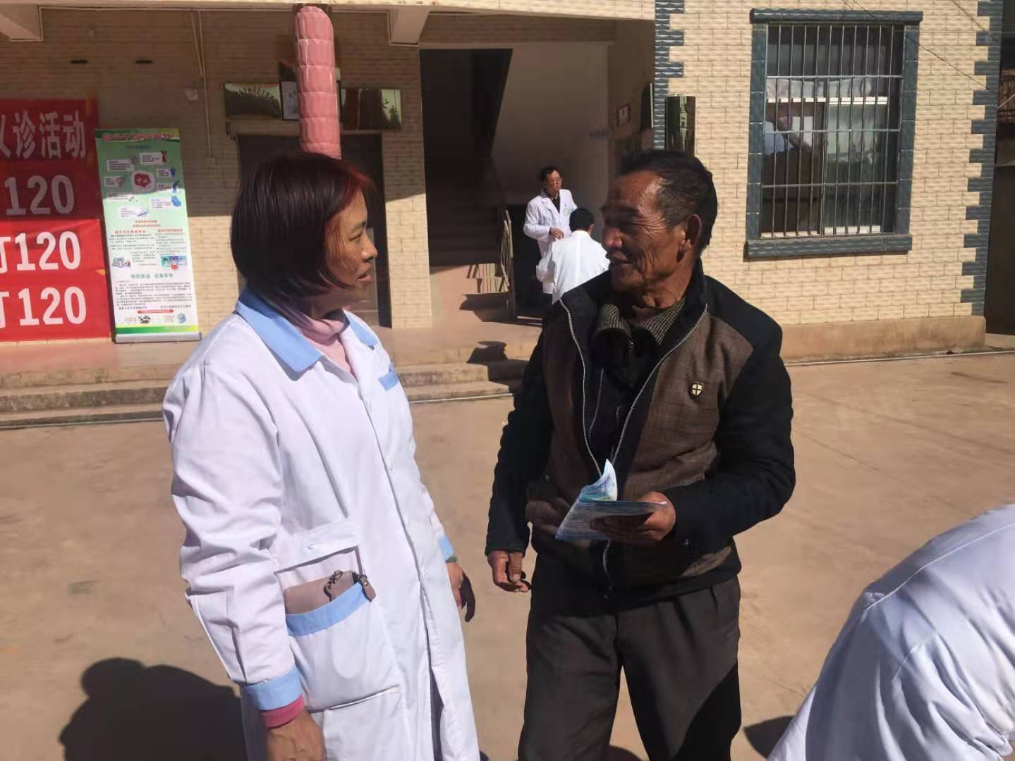 队员薛峰(武定县疾控中心副主任护师)每一位就诊过的病人,都被薛护士都热情拦住,递上厚厚的健康知识宣传手册,对于不识字的或者眼睛不好的老年人,薛护士说:“大娘,我来读给您听”。
