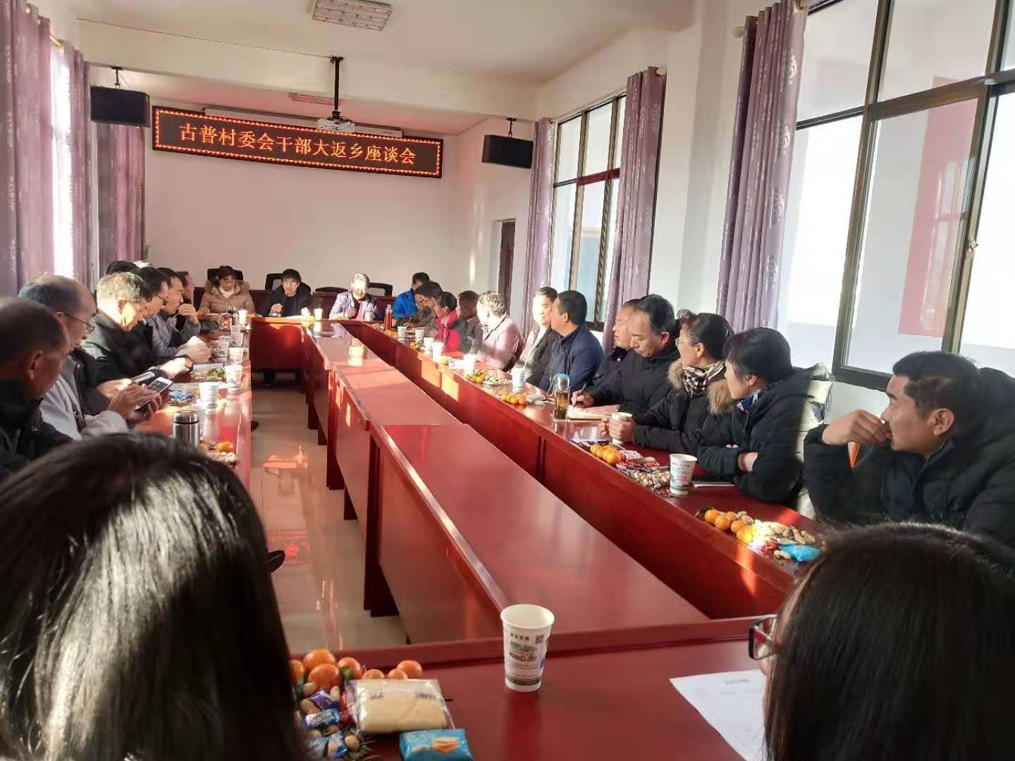 返乡干部、驻村干部、镇级干部、村三职、村民小组长坐在一起,开一个座谈会,驻村干部、镇级干部向返乡同志通报本村脱贫攻坚成效,返乡干部用家乡情怀,讲脱贫攻坚政策,教育引导父老乡亲,积极配合工作,增进干部群众感情,提升群众对脱贫攻坚工作的认同感、满意度。利用同吃家乡饭,共叙家乡情的机会,增进村乡邻里感情。