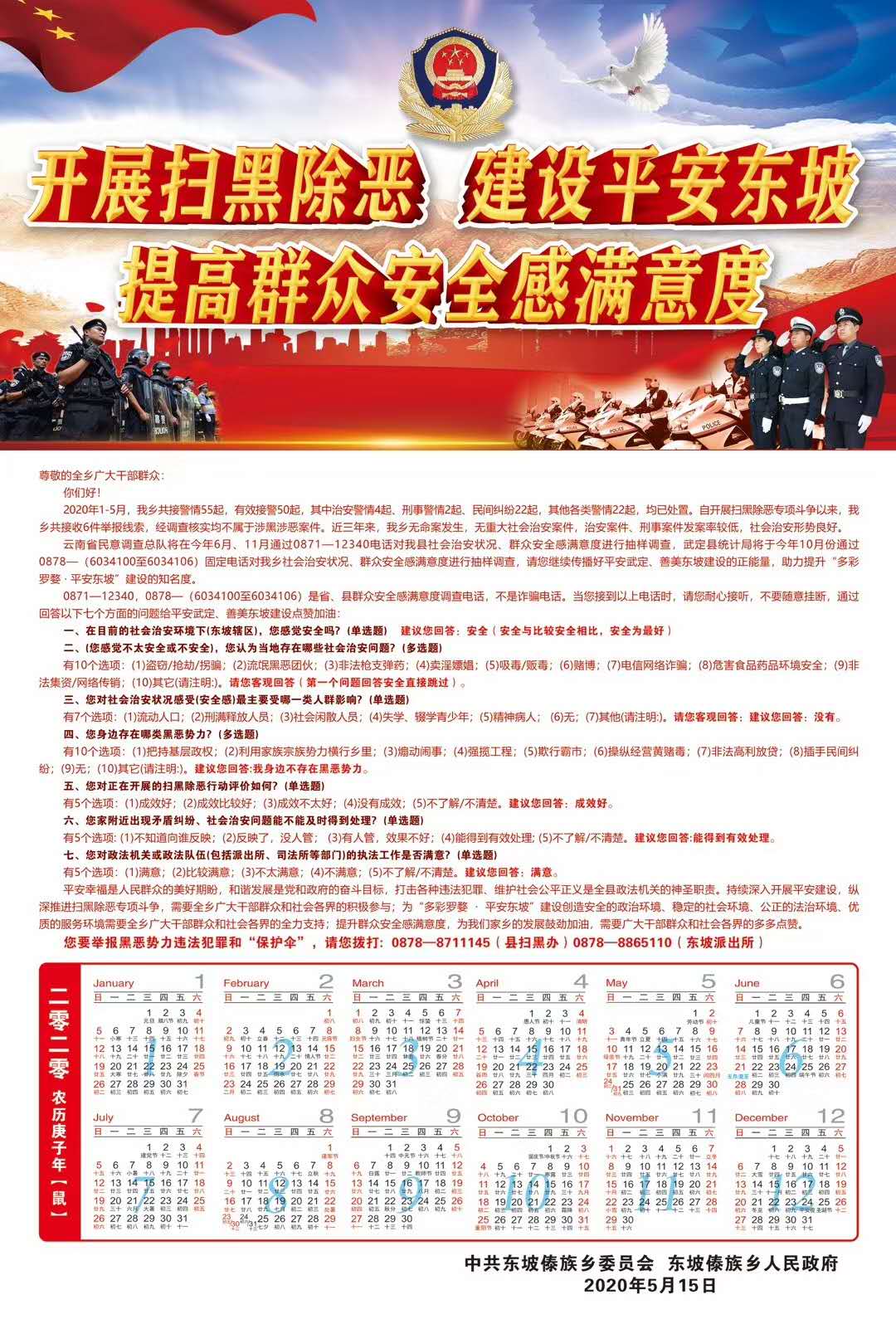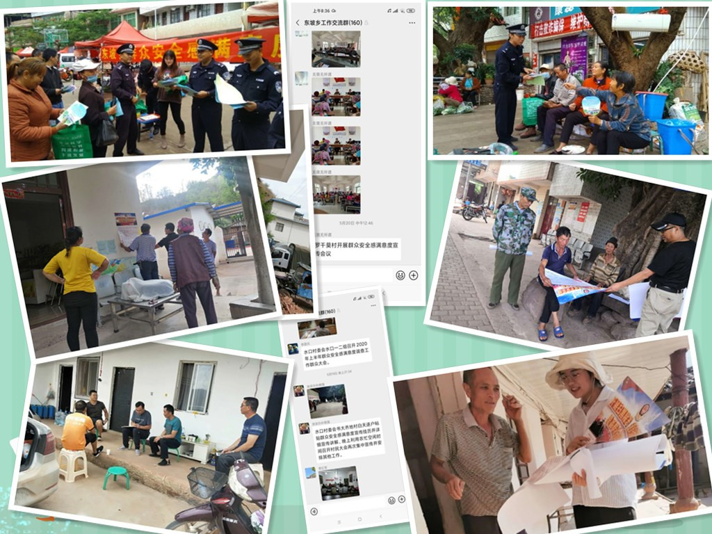 三是广泛发动,宣传到位。各村委会和中心站所作为本地区、本部门平安法治和群众安全感满意度宣传工作的第一责任单位,主要领导作为第一责任人,负责本地区、本部门平安法治和群众安全感满意度宣传工作的全面统筹协调推进工作。东坡乡按照“全覆盖、无死角、横向到边、纵向到底”的要求,充分利用会议、广播、电视、展板、悬挂横幅、张贴和喷涂标语、电子显示屏滚动、设立固定标牌、发放宣传材料、开展法制讲座等多种形式,认真做好宣传引导,力争覆盖到每一个单位、每一个村(组)、每一名干部职工、每一名群众,最终通过每一个人辐射到每一个家庭,从而使综治维稳、平安法治和群众安全感满意度调查工作做到家喻户晓、世人皆知,以此全面提高辖区和管辖内干部群众平安法治和公众安全感满意度调查知晓率和满意度,自5月中旬以来,东坡乡共开展各类不同场次宣传20余次,参与群众6000余人次。