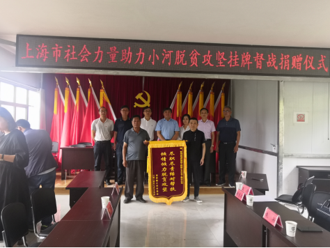 在捐赠仪式现场,高桥镇党委书记李文武同志向上海市嘉定区长期以来的关心和大力支持表示感谢,对小河村贫情作了详细汇报。随后,嘉定区合作交流办常务副主任潘展平代表上海市社会力量向高桥镇小河村委会捐助扶贫资金123.25万元,用于小河村扶贫项目开发。潘展平同志表示,攻克挂包督战村是最后的贫困堡垒,我们要齐心协力帮助打赢打好脱贫攻坚战。受捐赠的小河村委会向9家社会组织赠送了锦旗。
