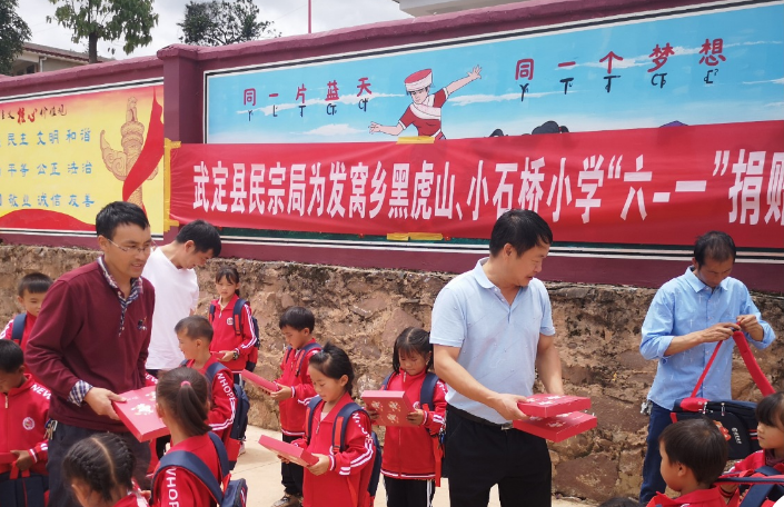 近日,武定县民宗局局长苏兴禄一行到发窝乡黑虎山小学和小石桥小学开展捐赠活动。苏兴禄实地查看了两所学校基础设施建设情况,详细了解教育教学开展情况,并向两所小学的学生捐赠价值10000余元的校服、书包、文具盒。