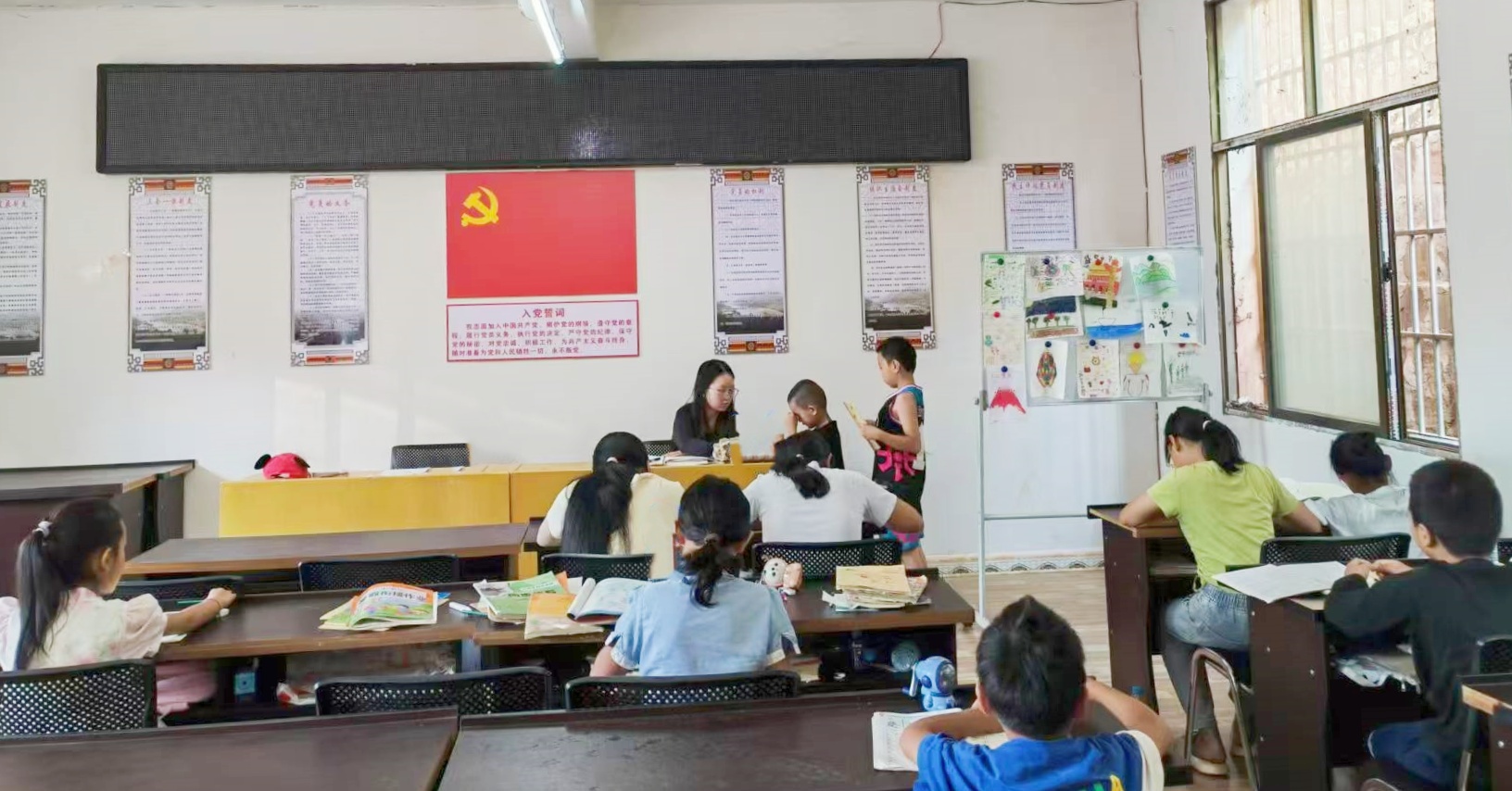 勐果村“青春相伴·‘益’起发光”公益小课堂由1名本村假期返乡老师和3名大学生组成,从去年暑假开始到今年已成功开办2期。主要围绕学业辅导、兴趣培养、安全教育三大核心主题有序开展。课堂上,孩子们有的坐在桌前写假期作业,有的围坐在一起翻看防溺水宣传手册,还有的跟着老师学叠千纸鹤,偶尔传来几句小声讨论,互动频繁,欢声笑语不断,学习氛围十分浓厚。