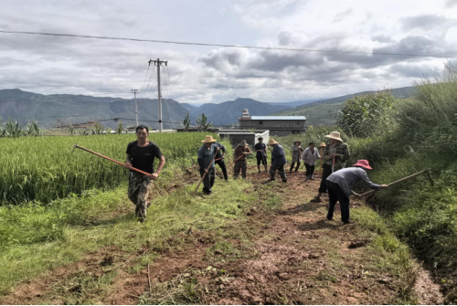 接到群众反映后,田心村党总支迅速行动,组织村干部实地勘察路况,第一时间制定修复方案,组织党员干部、群众共同投工投劳对禄丰村机耕道路及放水沟进行清理修复。施工现场,锄头挥舞、铁锹起落,党员们冲锋在前,挥汗如雨填补坑洼;村民们紧随其后,默契配合清理杂草、平整路面。大家分工明确、干劲十足,原本泥泞的道路在众人合力下逐渐变得平整坚实,为农耕生产打通了“生命通道”。