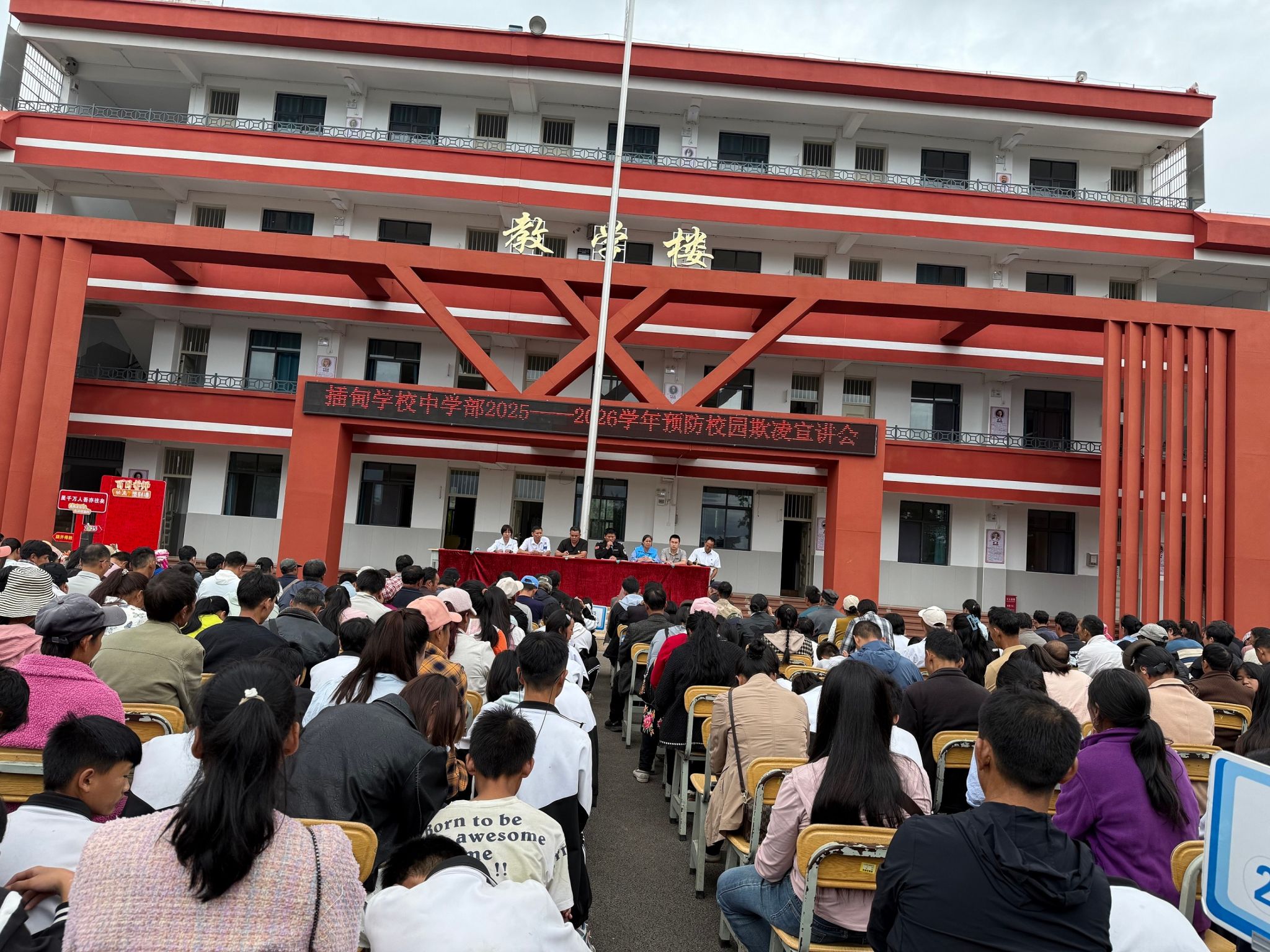 为切实增强未成年人法治意识,有效预防校园欺凌,营造安全、和谐的校园环境,2025年9月12日下午,插甸司法所联合镇派出所、法治平安办、卫生院到中学开展“拒绝欺凌,共同维护校园安全”主题送法进校园宣传活动,全校1000余名师生及家长参与活动。