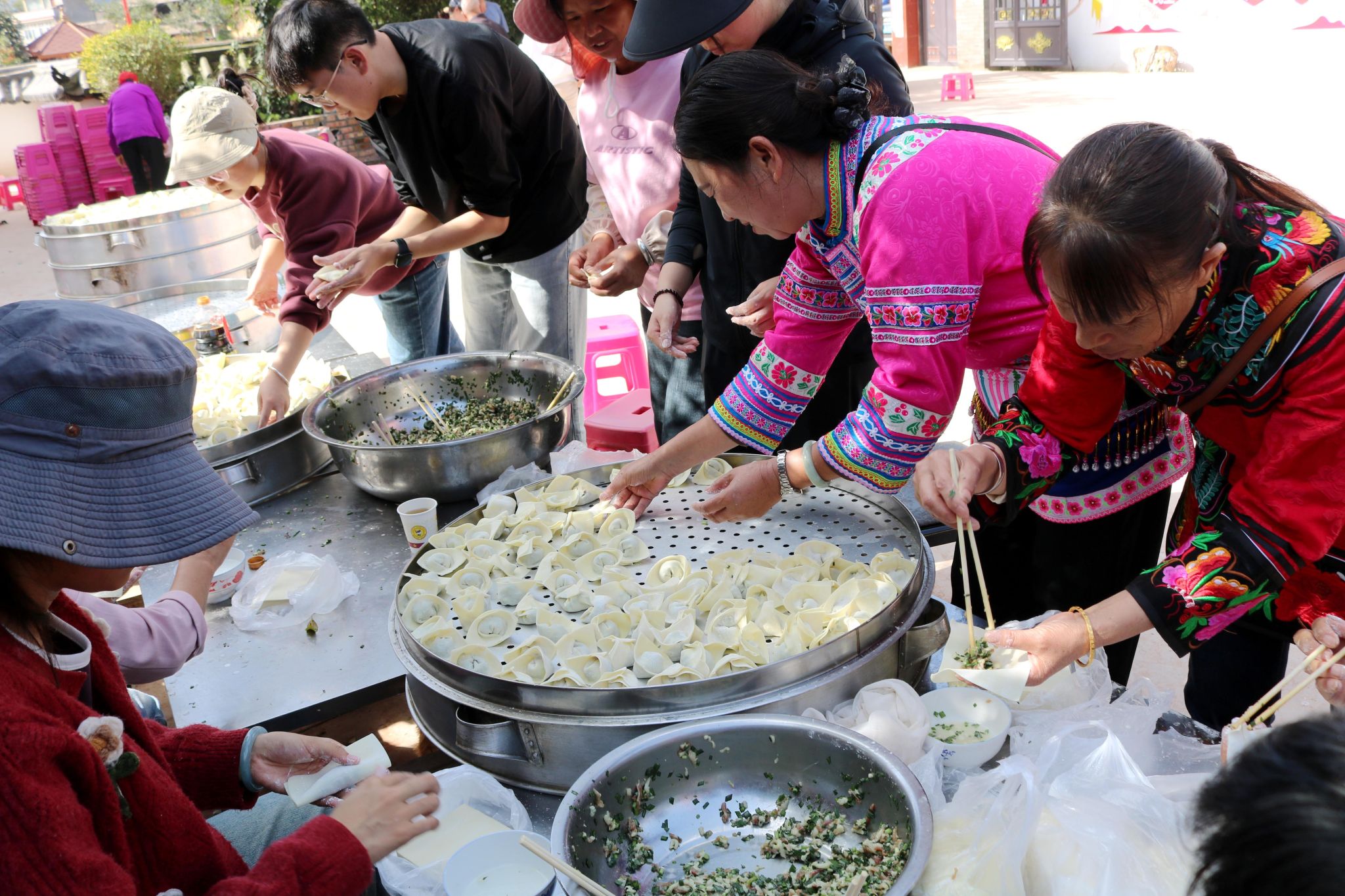 中午12点,金凤村的重阳活动正式拉开了序幕。村里的壮年男女拎着自家种的萝卜白菜、养的鸡鸭,带着米油肉蛋赶来,围在灶台边摘菜、切肉、下锅;志愿者们则围坐在院中餐桌旁包饺子,“你包的快、我包的好看……”互相比着、学着、包着,欢声笑语飘满小院。活动室后院的空地上,志愿者和老人们共同种菜,为金凤村老年食堂种下一排排应季蔬菜,种下同心的期盼。