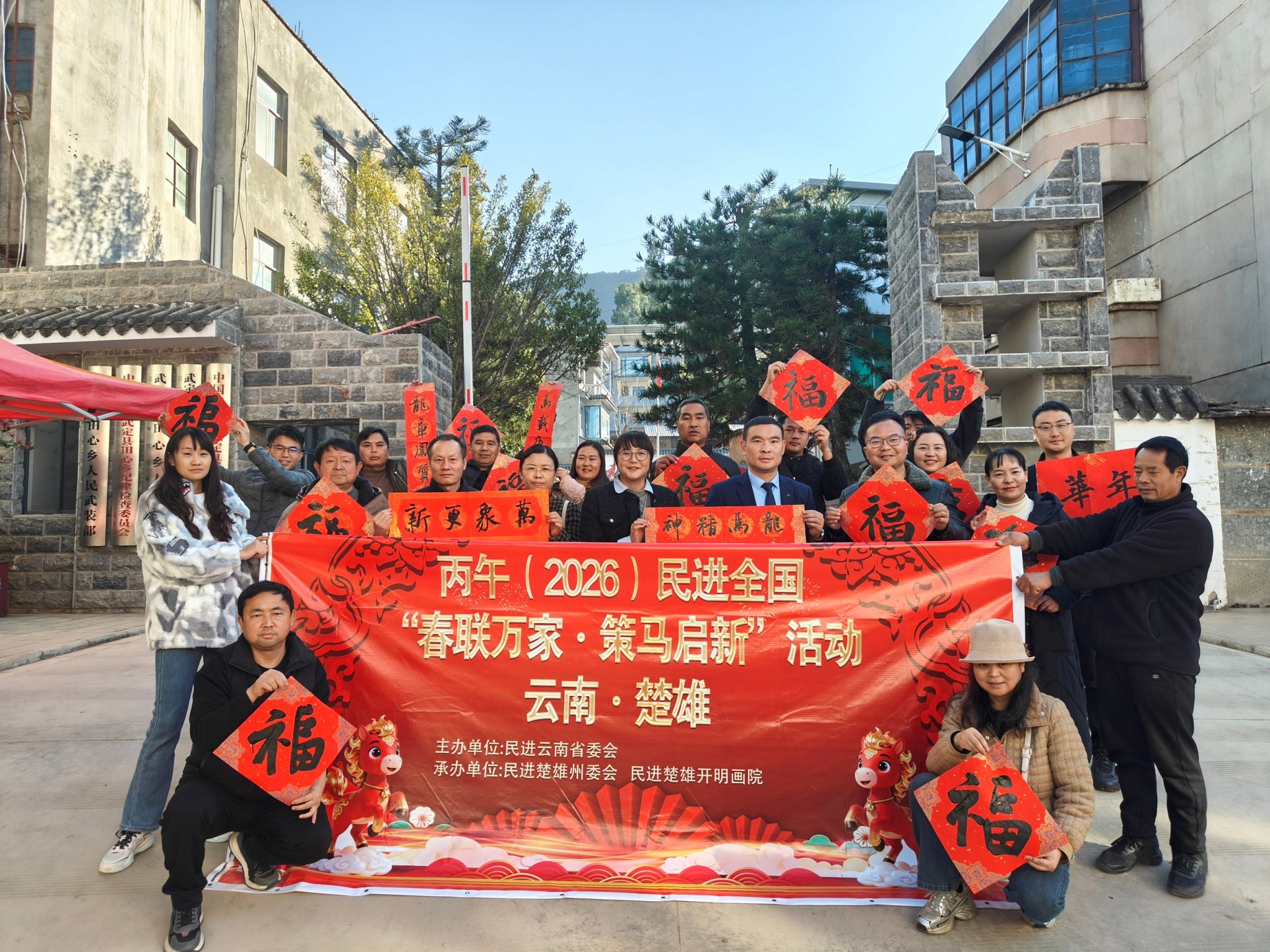 义诊同时,楚雄民进开明画院的5位书法老师同步开笔,铺纸研墨、挥毫泼墨,为群众免费书写春联和“福”字。一副副寓意吉祥的春联、一个个苍劲有力的“福”字新鲜出炉,墨迹未干便被争相领取。“手写的春联才有年味,贴在家里又喜庆又暖心,谢谢老师们送的新年祝福!”拿到春联的村民笑意盈盈,红火的春联映衬着幸福的脸庞,勾勒出冬日里温馨的乡村图景。