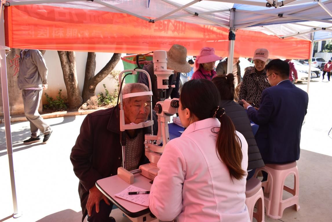 上午十点,田心乡政府院子里暖意涌动,楚雄爱尔眼科医院医护团队早早搭起义诊台,闻讯而来的群众有序排队等候。医护人员为大家逐一开展视力检测、电脑验光、裂隙灯检查,重点筛查白内障、青光眼等老年常见眼病,同时一对一答疑解惑,普及科学用眼和眼部保健知识。