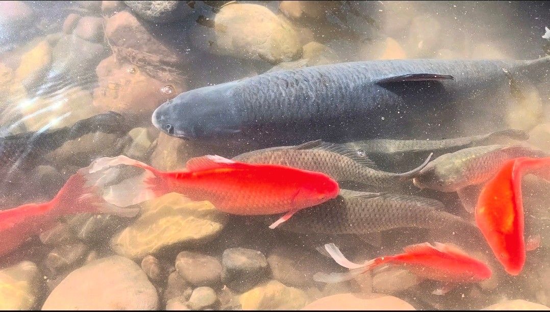 图为:放入摸鱼池的青鱼王和锦鲤 叶伟琳摄
