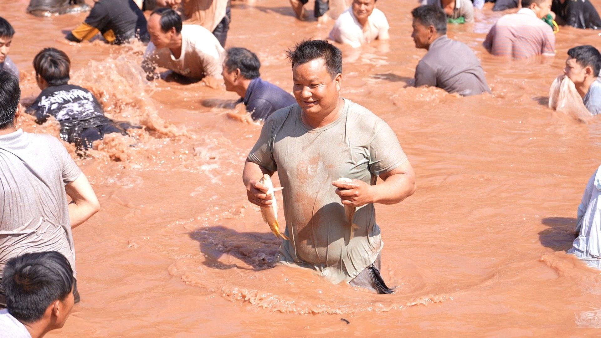 作为奥巴节的“重头戏”,万人摸鱼活动将气氛推向高潮。随着一声令下,游客们纷纷撩起衣袖、挽起裤脚跃入水中,或俯身摸索,或追逐嬉戏,水花四溅、笑声不断。岸边加油声、快门声交织,大人重拾儿时乐趣,孩子初探自然野趣,不分民族、不分地域的人们在摸鱼中传递着新春的祝福与喜悦。
