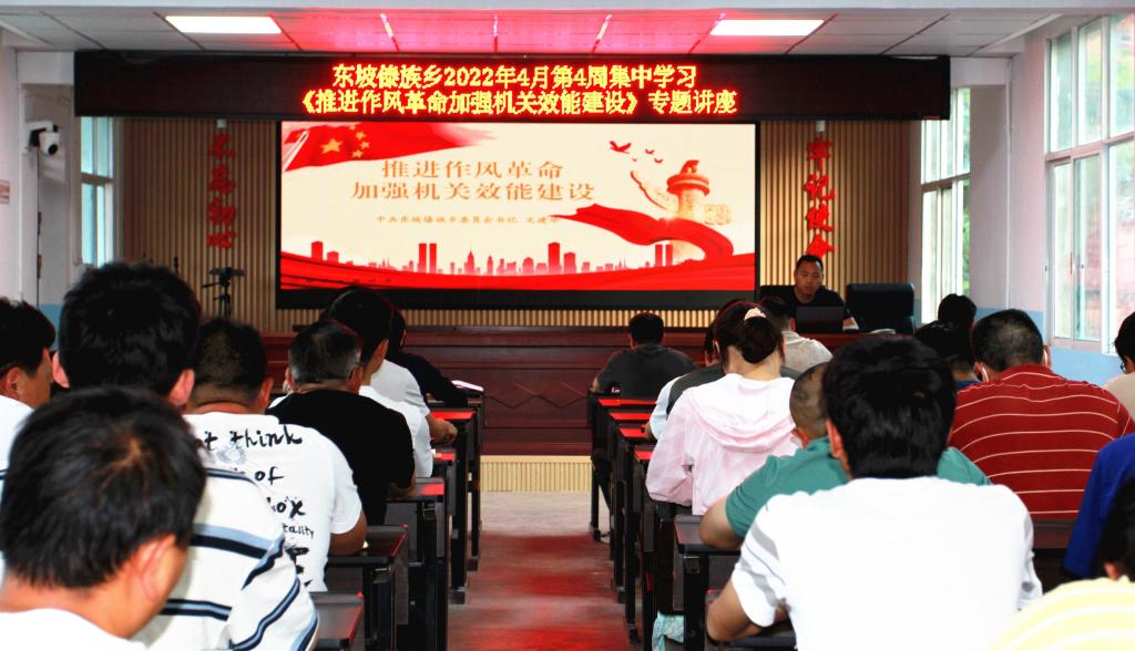 为深入学习贯彻省委关于推进作风革命、加强机关效能建设的相关工作要求,使作风革命、效能革命贯穿于全乡经济社会发展的全过程、各方面。4月27日晚上7点,东坡乡开展推进作风革命加强机关效能建设专题学习,对转作风、提升效能发出了强烈信号,表明了乡党委政府干事创业的坚定态度和决心。全体干部职工60余人参加会议,乡党委书记文建华主持会议并做专题辅导。