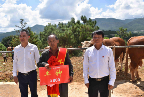 比赛现场,围观群众议论纷纷,寻找自己眼中的“牛魔王”。参赛牛在主人的牵引下,依次踏上地磅,在不断的惊呼声中,角逐出一等奖1名,获牛魔王称号,二等奖2名,获牛神称号,三等奖3名,获牛王称号。乡党委书记曹吉,乡党委副书记、乡人民政府乡长杨成武为获奖牛及牛主颁发荣誉证书。