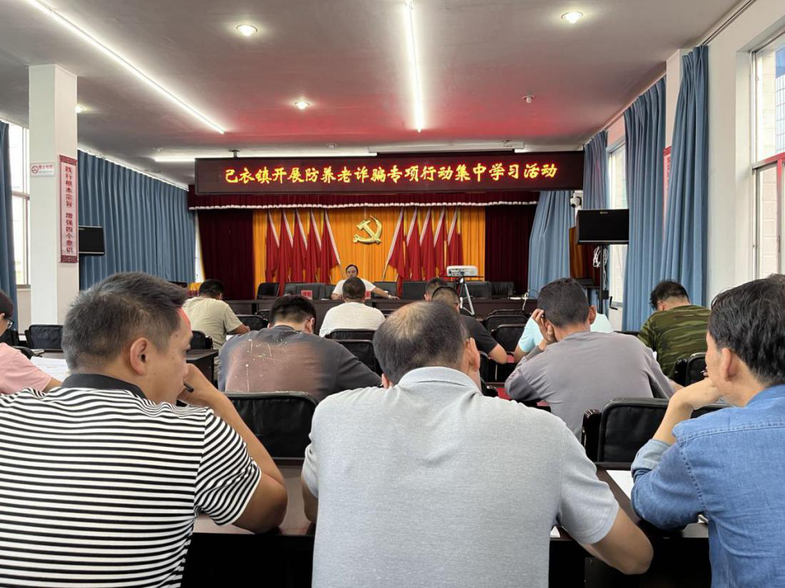 养老诈骗套路多,很多老年人被不法分子以服务养老、关爱老人等多种名义和形式进行诈骗,造成被骗老人在遭受财产损失的同时,还要承受巨大的心理压力,严重影响晚年生活幸福感、获得感。为守护好老人“养老钱”,让老人远离养老诈骗,安心度晚年,己衣镇开展预防养老诈骗专项行动集中学习活动。分管政法工作的谭副镇长分别从当前养老诈骗现状、骗局类型、如何预防诈骗等方面进行开展学习交流活动。