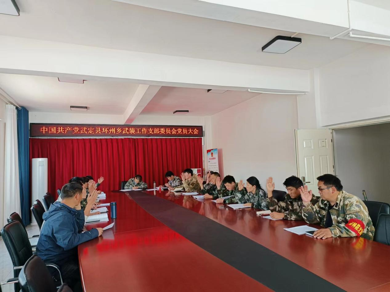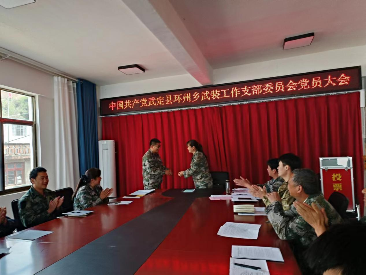 环州乡党委立足工作实际,坚持党管武装工作原则,强化党管武装的责任意识,贯彻党管武装的各项制度,本着业务相通、地域相近、人才融合的原则,将乡社会事务办、退役军人管理服务站、环州村民兵应急排中的党员纳入党支部进行管理,确保起到加强力量、资源整合、提高效率的效果,乡党委认真谋划,精心组织,严格按照《中国共产党基层组织选举工作条例》的相关规定,召开武装工作党支部党员大会上,按程序选举产生支部委员,支部书记、副书记。选举产生乡党委委员、武装部部长李海欧同志为武装工作党支部书记。
