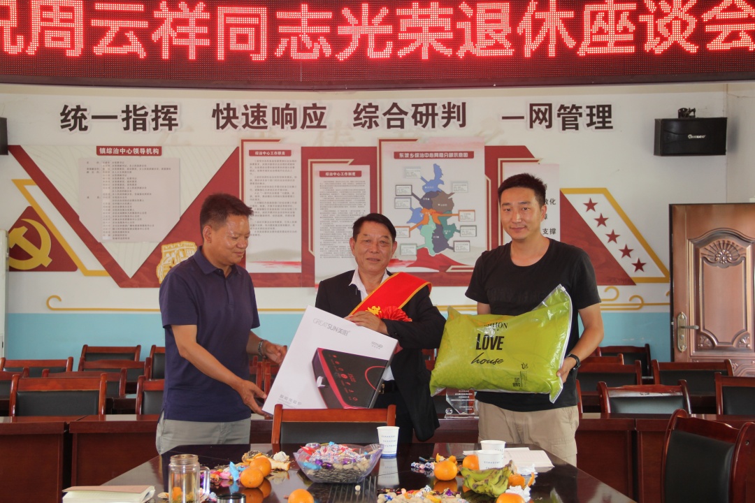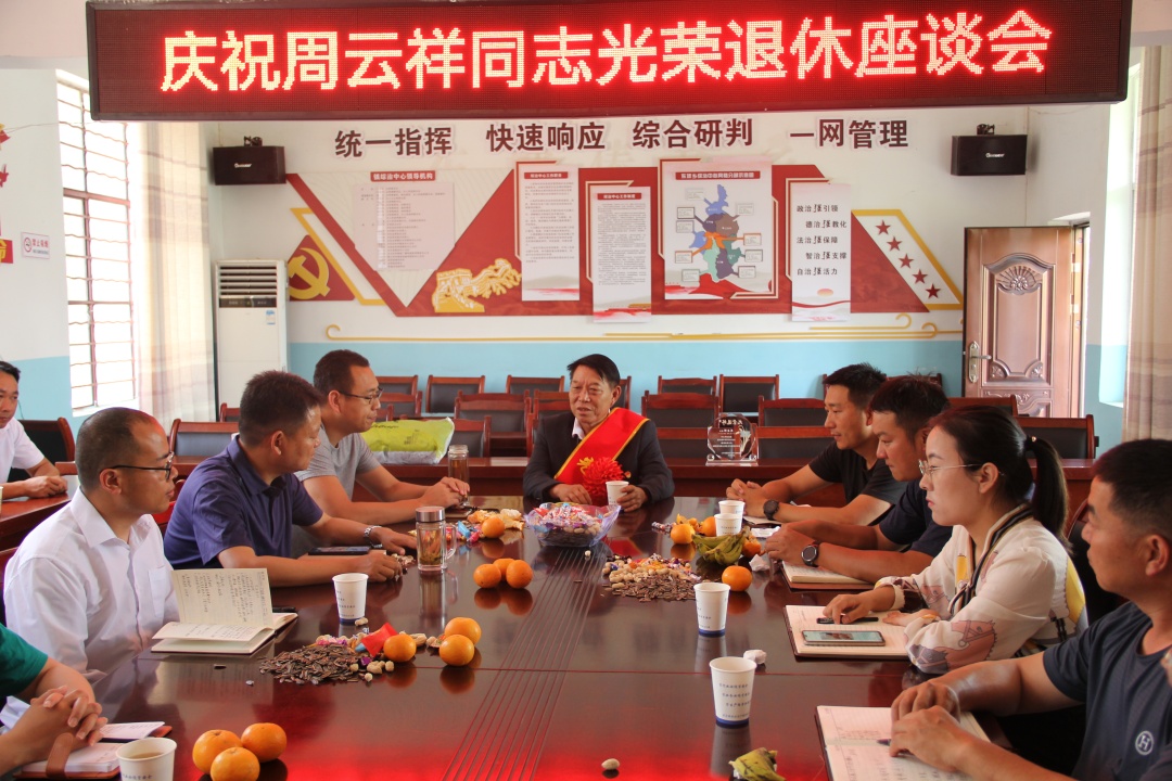 文建华回顾并肯定周云祥同志在岗多年来的工作业绩和辛勤付出,代表乡党委、政府衷心感谢他为东坡发展所作出的贡献,希望老干部退休不褪色,永葆忠诚纯洁的担当本色,积极建言献策,并常回家看看,为东坡发展继续贡献力量。