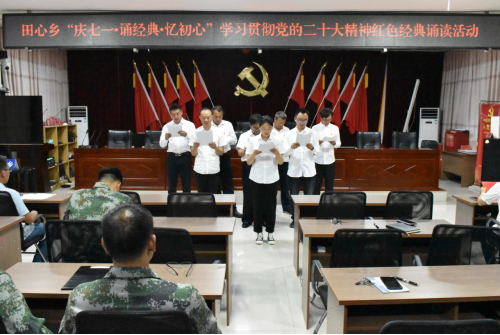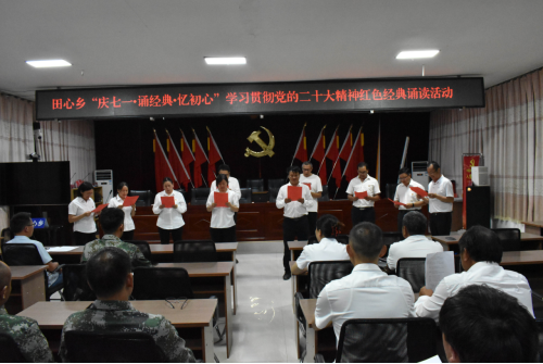 6月28日,为庆祝中国共产党成立102周年,讴歌党的丰功伟绩,弘扬革命精神,传承红色基因,继承和发扬党的优良传统和作风,进一步提升党员干部党性修养、强化使命担当。在“七一”建党节来临之际,田心乡举办了“庆七一·诵经典·忆初心”为主题的学习贯彻党的二十大精神红色经典诵读活动。
