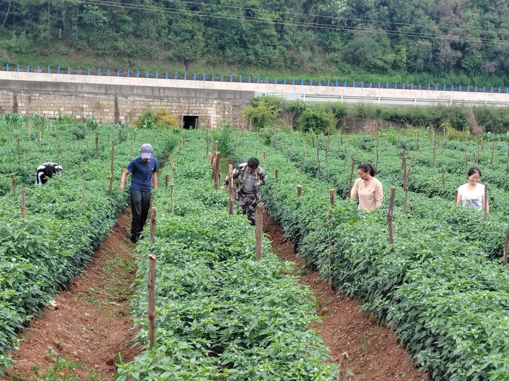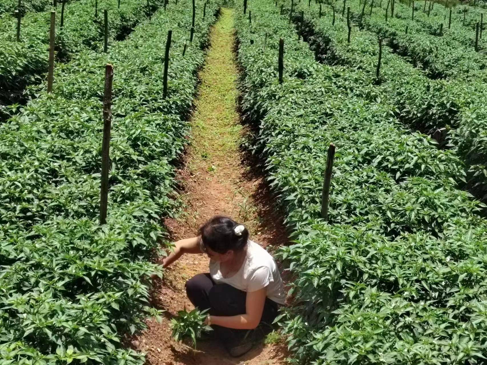 时下,正值辣椒中耕管理的黄金时节。笔者走进武定县猫街镇永泉村的美人椒种植基地看到,村民们来回穿梭在郁郁葱葱的“绿浪”中,熟练地清除杂草、追施肥料。