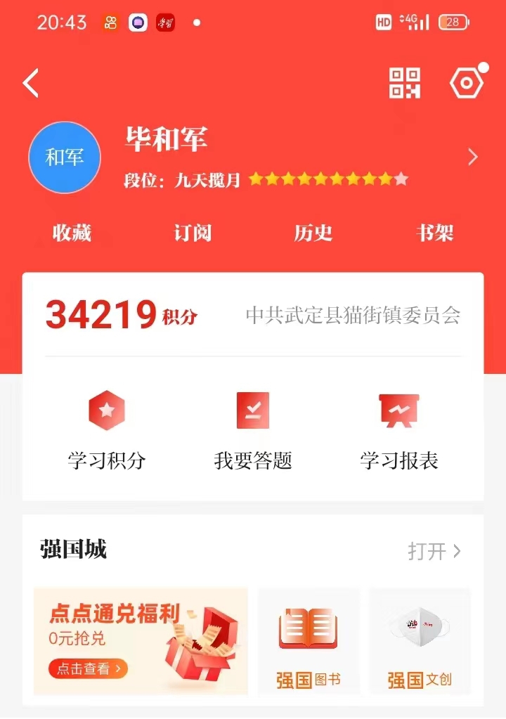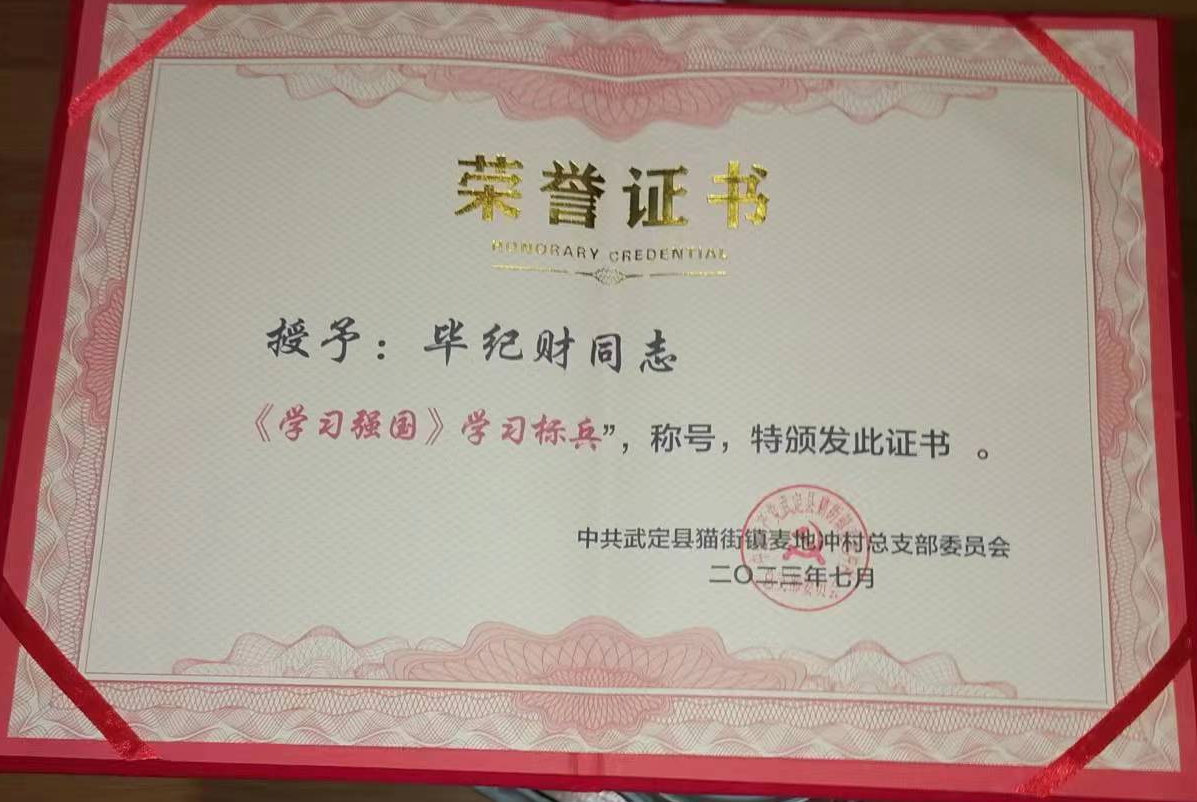 党员毕纪财登录“学习强国”APP,点开他的“学习积分”,每项任务栏的进度条都是满条的红色。为促进基层农村党员使用“学习强国”,麦地冲村党总支将学习强国积分纳入到农村党员与村党支部的考核条件中,让大家在比学争优的氛围中不断进步。截止到2023年7月1日,麦地冲村党总支部分党员“学习强国”总积分和年度积分排名进入猫街镇十五个村党总支前列。以点带面,通过表扬优秀“学习强国”学习标兵称号树立好榜样,我们将不断争优,让更多的基层农村党员站在前列。