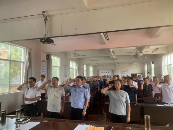在南街社区党总支庆祝中国共产党成立102周年大会上,党员们面向党旗肃立,社区党总支书记孔祥辉同志庄严领誓,大家高举右拳,重温入党誓词。