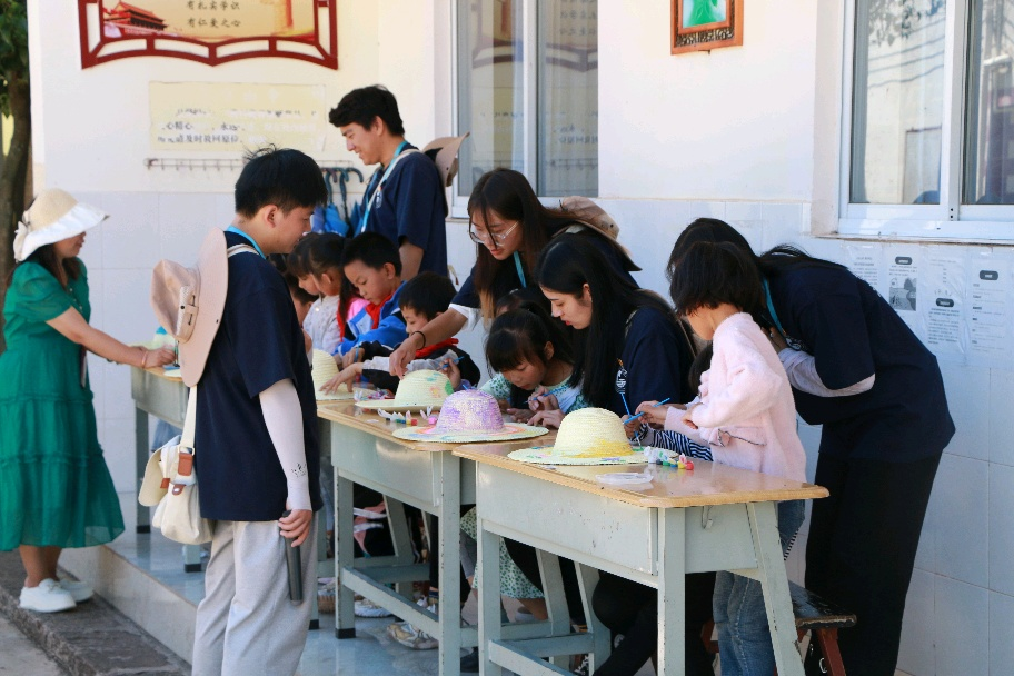 7月17日,队员们来到海子村白泥坡小学,在“典耀中华”诵读环节中,队员们与同学们一起诵读经典古诗词,纠正同学们咬字发音的同时,以诗情滋养心灵,传承中华民族的悠悠文脉。“翰墨飘香”毛笔字教学环节,队员们手把手帮助同学们掌握书写的握笔要领和正确坐姿等,让同学们在一撇一捺中感受书法之美,在书写中感受中国传统文化之美,在文化认同中铸牢中华民族共同体意识。而在“帽”美如画环节,同学们变身乡村小画家,在草帽上用颜料绘制心中最美的图画。