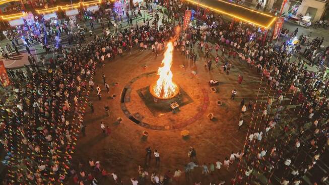 夜幕降临,篝火燃起,熊熊的火焰照亮了整个广场,也点燃了各族群众和游客的热情,男女老幼围着篝火跌脚狂欢,欢歌笑语,现场一片欢乐祥和的景象。