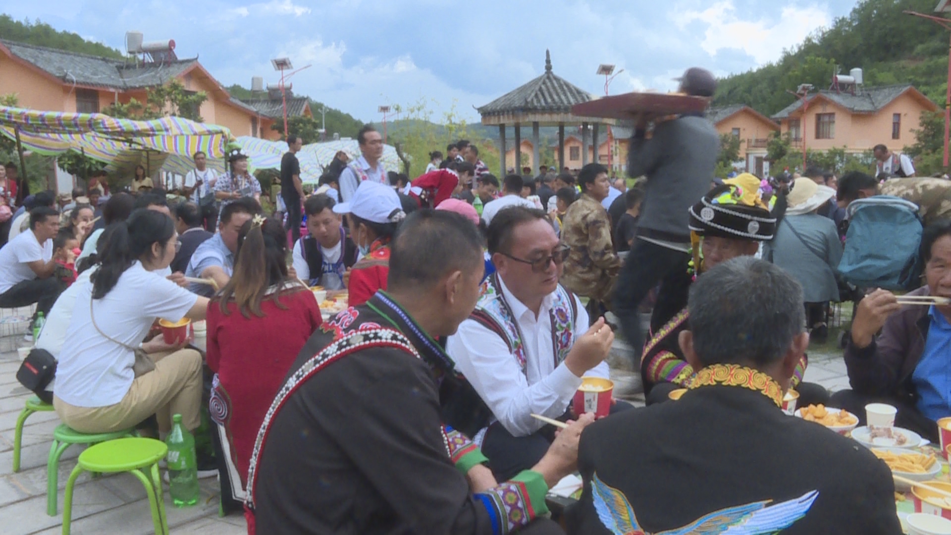 在发窝乡养马场村举办的长街宴,宴席从村头延续近村尾,客人们和当地村民欢聚一堂,一边品尝民族传统美食、一边高谈畅饮,现场满是欢声笑语。