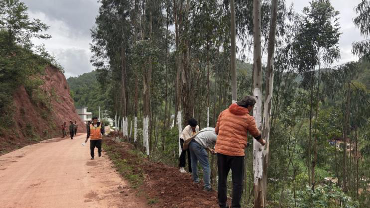 绿化美化进村委会主干道。麦地冲村位于猫街镇西南面18公里,共11个自然村1022人,境内常住人口全是彝族,组织起来的彝族群众本着“不放过一个盲区,不留一个死角”的要求,每周开展房前屋后“五堆十乱”专项整治,在保证自家房子周围“一亩三分地”干净整洁的情况下,积极响应村委会号召,对村庄道路两侧的杂草、枯枝、土堆、乱石进行清理,趁着雨季沿路播种万寿菊、涂白树干。动用挖机30余小时,投入人力60余人,花籽3公斤,油漆10余桶,完成了9公里的进村道路绿化美化。