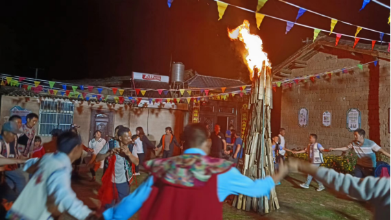 夜幕降临,村寨的人在老人选定的地点搭建祭台,以传统的方式点燃圣火,用火光来驱除病魔和灾难、祈祷来年风调雨顺、村民幸福安康。祭火仪式结束后,让人期待的火把狂欢开始了,彝家小伙吹起了竹笛,阿哥阿妹们应着竹笛声唱起了歌,跳起了舞。