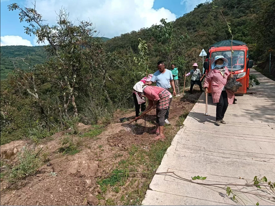 此次植树活动地点为滔谷村主线公路、支线公路、村庄房前屋后,共种植樱花800株,樟木700株,共计1500 株,折合面积30余亩。植树现场,大家带上工具、背上背篼,热情高涨、干劲十足、积极行动,兴致勃勃地参与到植树活动中,他们两三人为一组,挖坑、扶苗、填土、浇水,各个环节衔接有序,配合默契,一棵棵树苗被合力种下。