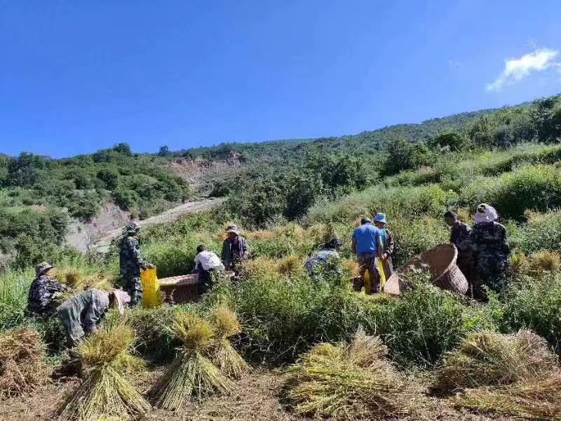 近日,路己荒坡开辟出的稻田迎来了丰收。9月14日,自乌村党总支组织干部群众20余人前往收割,由于是荒坡临时开辟的稻田,机械无法到达,一行人便顺着山脊用镰刀开辟出了一条临时通道。趁着清晨凉爽,大家戴上手套、拿起镰刀就开工。年轻人负责收割、装填、搬运;中老年负责剥离、捆绑;村委会女干部也不逊色,不仅在村务工作中是一把好手,干农活也不含糊。大家一刻也不敢停歇,忙碌了两三个小时终于完成了收割工作。