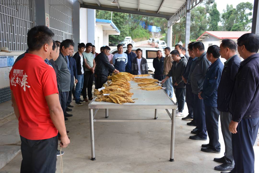 第一阶段,全体参会人员到己衣镇烟叶站进行现场观摩收购样品。己衣烟叶站站长罗宏介绍了目前我镇烟叶生产情况,并对今年烟叶收购流程及准备工作简要说明。合作社负责人杨玉龙对烟叶收购分类定级及标准作指导。