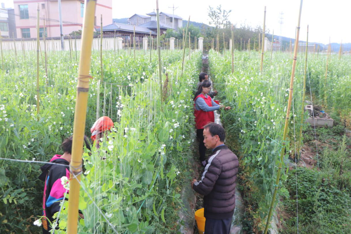 为提高荷兰豆产量和品质,昆明聚丰农业发展有限公司派专家和财务赴平地村驻扎,随时随地观察荷兰豆生长变化以便及时做出养护措施。从捞沟、播种、覆膜、除草、拉线、间苗到采摘的全过程需要精心管护,就需要大量劳动力。两个月来,促进当地群众就近务工累计2000余人次、劳务创收20余万元。“这个活计方便我照顾家里,也没有摘烟那么累,还学会了拉线、间苗等好的技术嘞,悄悄和你讲,这么好的收益,明年我也要种哩。”一位帮忙干活的大姐如是说。