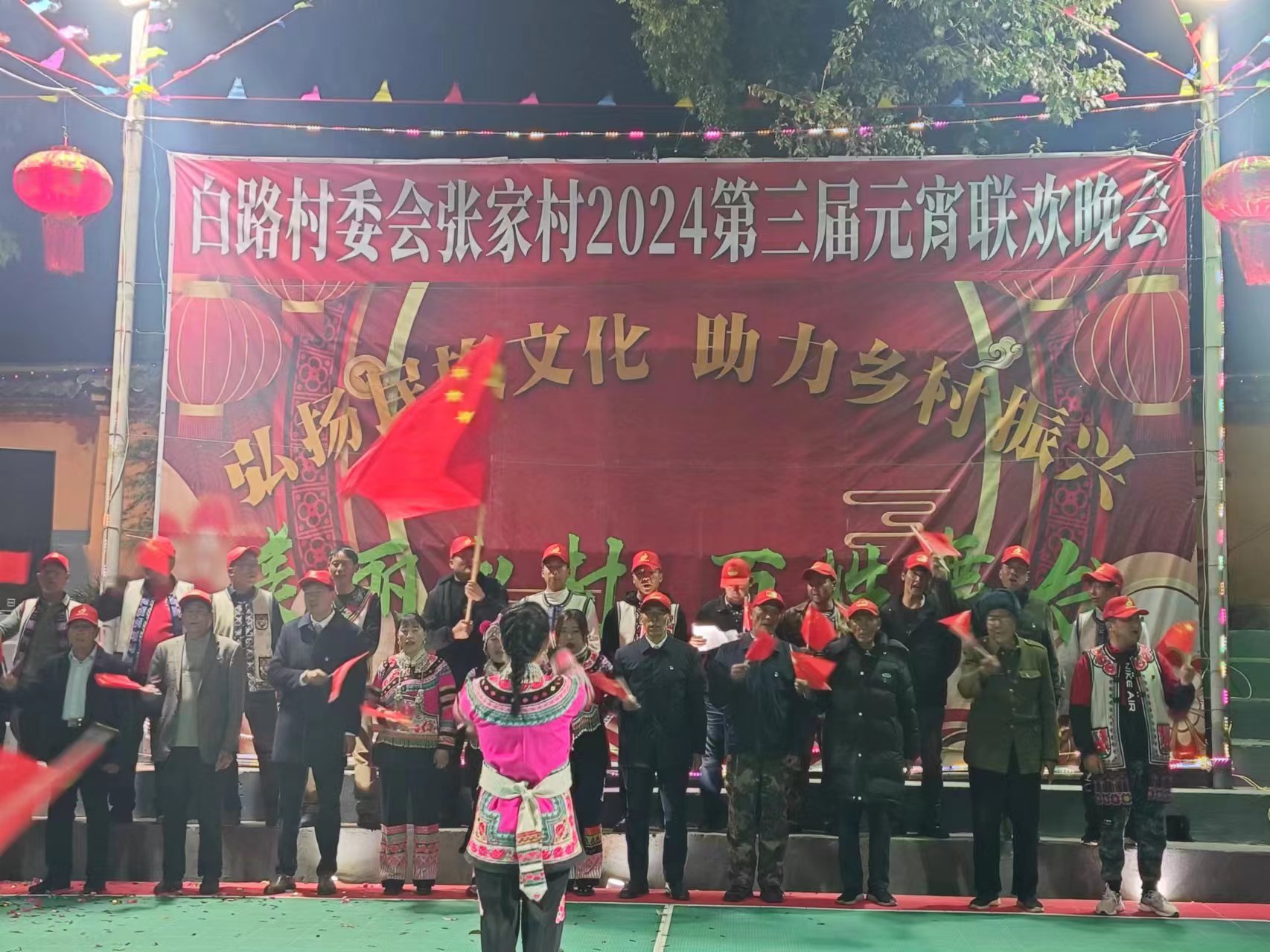 在张家村“村晚”现场。古老神秘的毕摩祈福仪式拉开了张家村村晚序幕,由张家村党支部全体成员、张家村村委班子成员合唱的《歌唱祖国》、舞蹈《我在张家村等你》、酒歌《高兴唱一调》、情景舞蹈《回家过年》、演讲《1949》、葫芦丝《婚誓》、二人转《逛新城》等精彩节目轮番上演。演员们从5岁孩童到70岁老党员,他们满怀激情,用动听的歌声,优美的舞姿,抒发了对家乡的热爱,唱出心中的向往,舞出甜蜜的生活,彰显美好的未来。