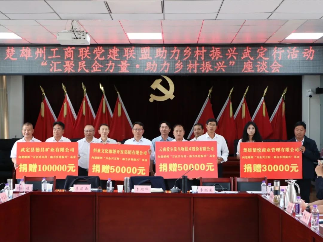 会议期间,组织开展了党建联盟助力乡村振兴捐赠活动,州工商联社会组织党支部、温州商会党支部、湖北商会党支部、湖南商会党支部、志同商会党支部5家州直属商会及云南爱尔发生物技术股份有限公司、恒业文化旅游开发集团有限公司、德昌矿业有限公司、楚悦商业管理有限公司4家州工商联副主席、副会长企业向武定县11个乡镇捐赠资金、物资等共计33万元。