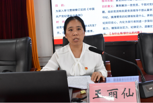 王丽仙主任从《条例》修订历史概况、修订的重要意义、《条例》的总则和修订的主要内容、《条例》修订内容重点解读、如何抓好《条例》的贯彻执行五部分内容对《中国共产党纪律处分条例》进行讲解辅导,讲解突出以案说德、以案说纪、以案说法、以案说责,让党员干部受警醒、明底线、知敬畏。