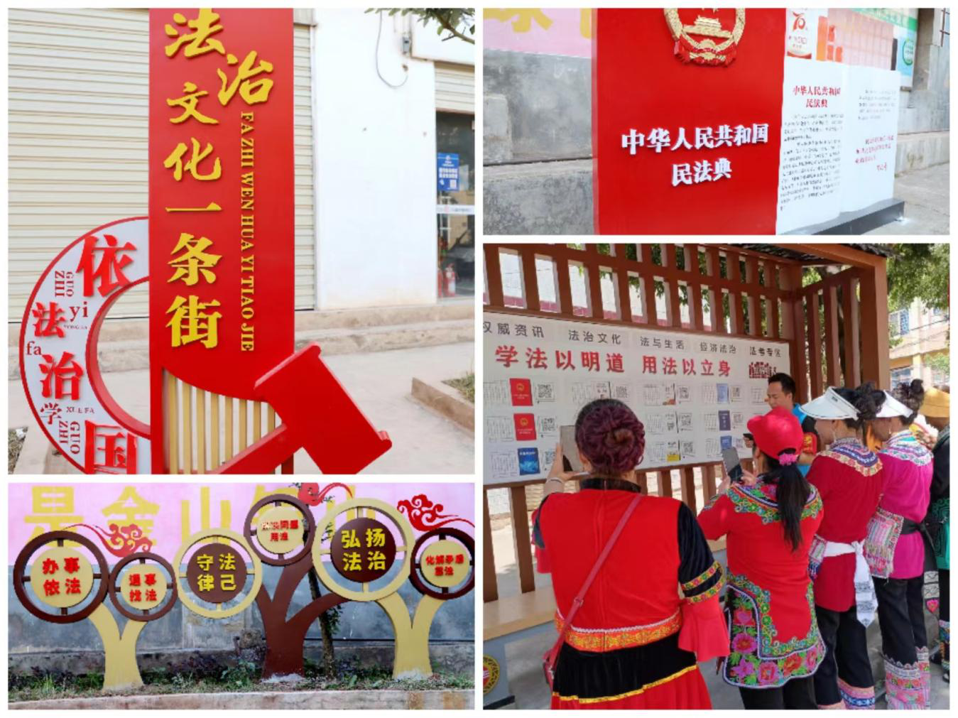 猫街镇法治文化一条街将地方元素、民族文化与法治文化相融合,以中华人民共和国民法典主体编目为纲,以最为多见的民法知识点为主要普及内容,采取“法律法规条文摘要、扫码学法、法律问答、法治漫画”等图文并茂的形式,阐述了与百姓生产生活密切相关的法律知识,语言通俗易懂,真正地让中华人民共和国民法典走到群众的身边,让群众实实在在感受到法治的魅力。