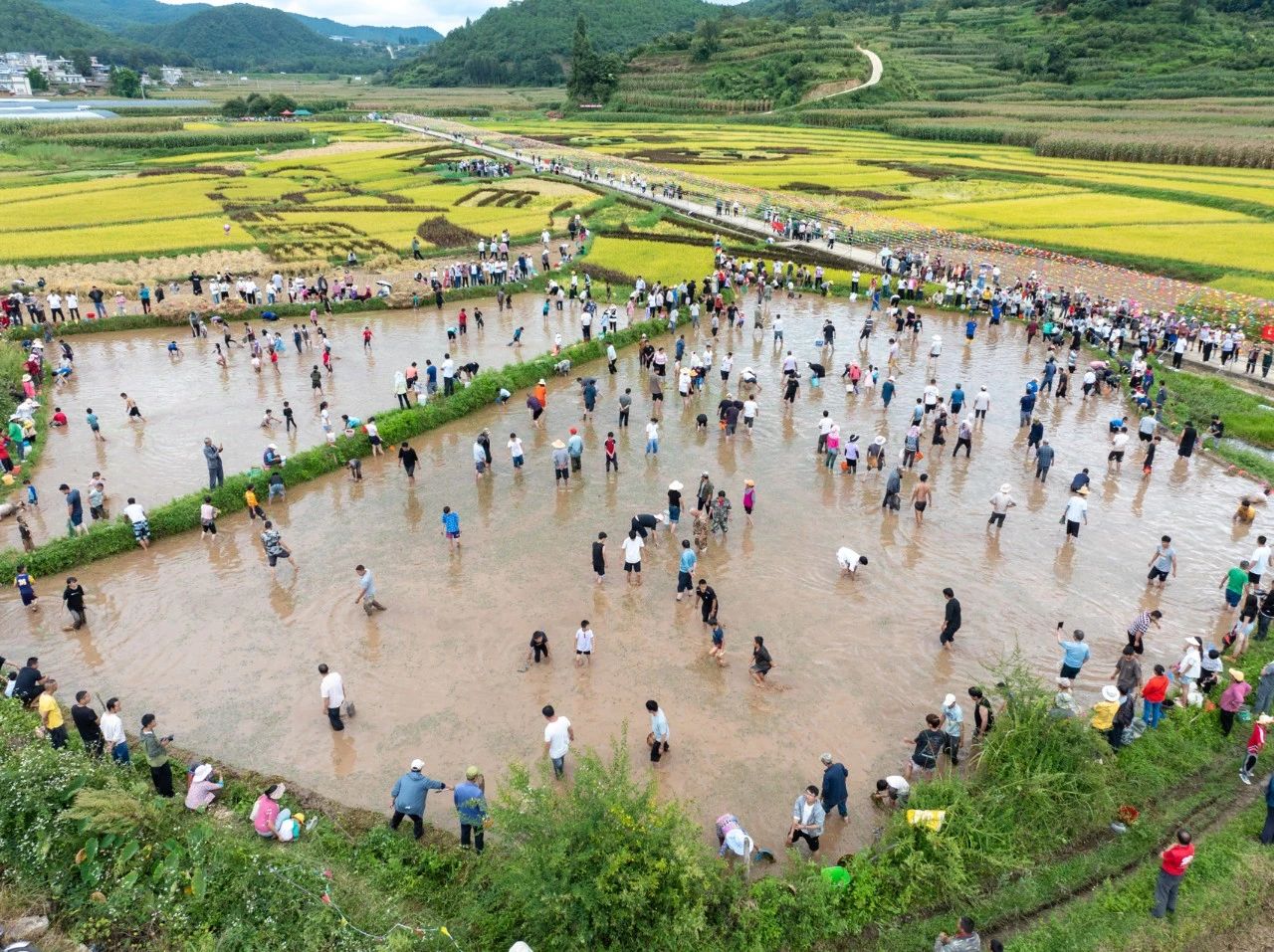 畅享丰收田野乐,趣味无限展风采。“稻香渔湾”抓谷花鱼、赏田画、斗鸡、巧手抹苞谷、同舟共济、变装大赛......一个个形式多样的农趣竞赛让游客参与其中,与当地群众互动起来,共同体验农耕文化,展示劳动风采,在收获当地特色礼品的同时,一起感受丰收的喜悦。