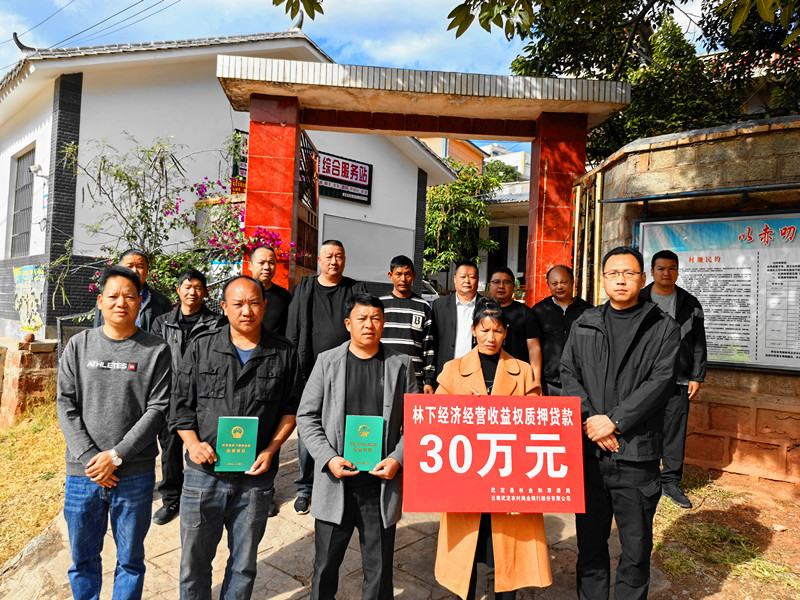 颁发仪式上,东坡傣族乡党委政府为以赤叨村委会致富带头人李文江和村委会副主任李永忠颁发了东坡乡首批林下经济经营收益权证,致富带头人李文江持经营收益权证在云南武定农村商业银行获得质押贷款30万元。