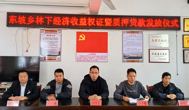 11月27日,东坡傣族乡第一批林下经济经营收益权证暨质押贷款发放仪式在以赤叨村委会举行。乡党委书记文建华、乡人大主席团主席李继舜及相关部门负责人参加仪式。