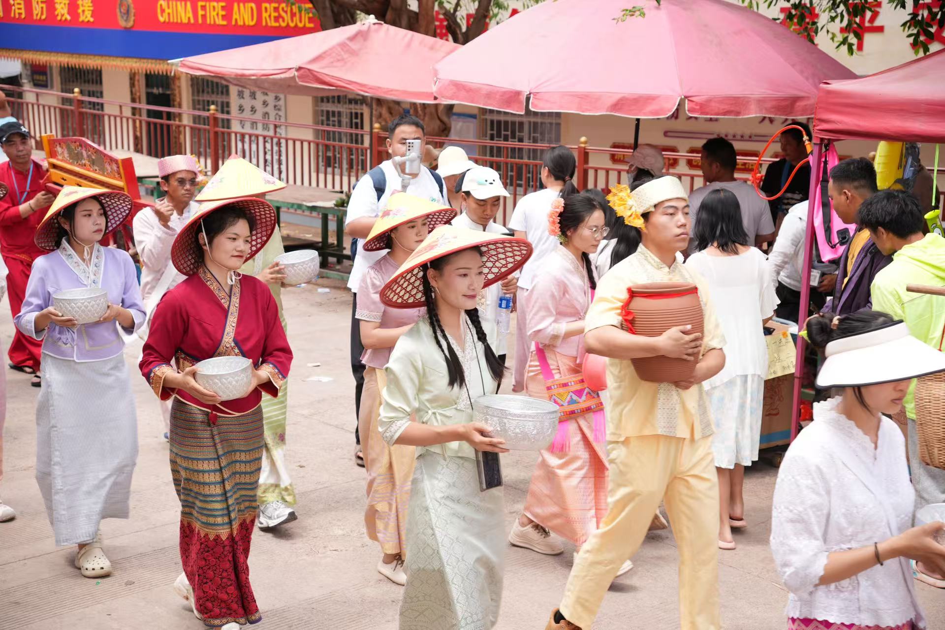 下午,身着节日盛装的傣族群众齐聚集镇广场举行了古老而庄严的祈福仪式,现场祈愿声、铓锣声与象脚鼓声交织,人们沐浴在用柳枝撒下的“圣水”下祈愿风调雨顺、五谷丰登。随后,傣族青年男女纷纷跳起噶光舞,表达对自然的敬畏与感恩,对幸福生活的期盼。