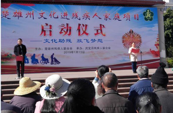 2019年,是武定县决胜脱贫攻坚工作和全面建成小康社会的关键之年,在此举行楚雄州文化进残疾人家庭项目启动仪式,是对武定县残疾人工作的一次检阅和鞭策,武定县党委政府、县残联将强化责任担当,为全州文化残疾人进家庭项目的实施开好局、当好表率,切实推进基层残疾人文化建设工作,引导广大残疾人积极参与文化活动;坚定文化自信,让残疾人共同分享国家繁荣昌盛,社会进步和谐的优秀成果,以全社会都来关心关爱残疾人的扶贫助残新风尚,传递社会正能量,提升广大残疾人的获得感、幸福感,在全面建成小康社会,决战脱贫攻坚的征程中不让一个残疾人掉队。