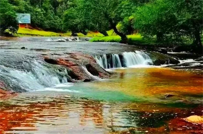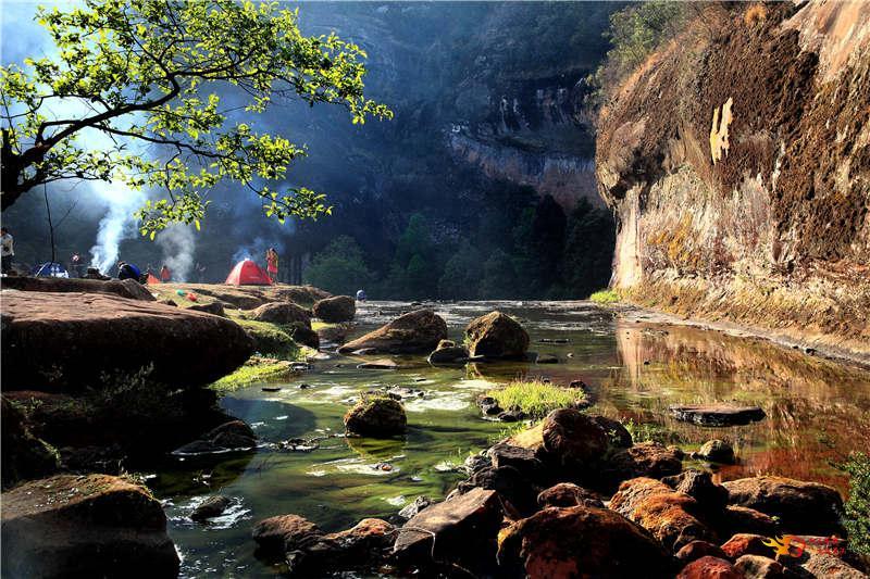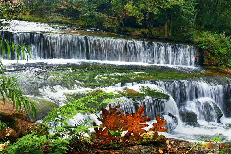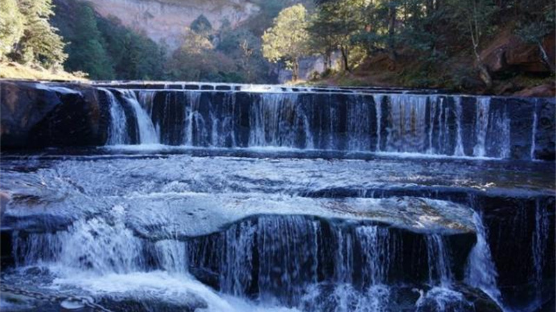 大自然的天工之作,造就了水城河数道不同类型的瀑布,河床两岸巨大奇特的红砂岩与原生植被交融一体,形成亮丽的景观。