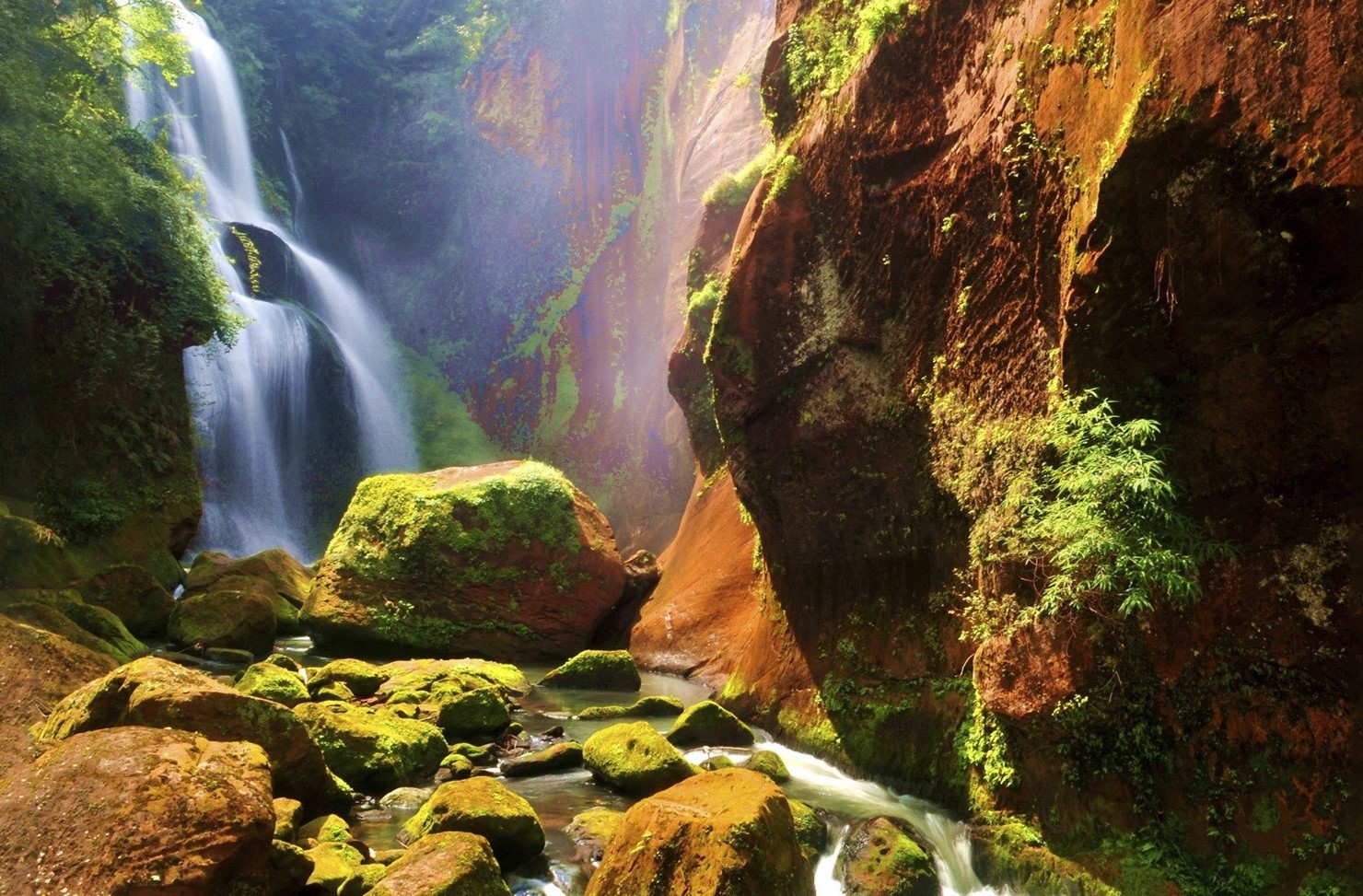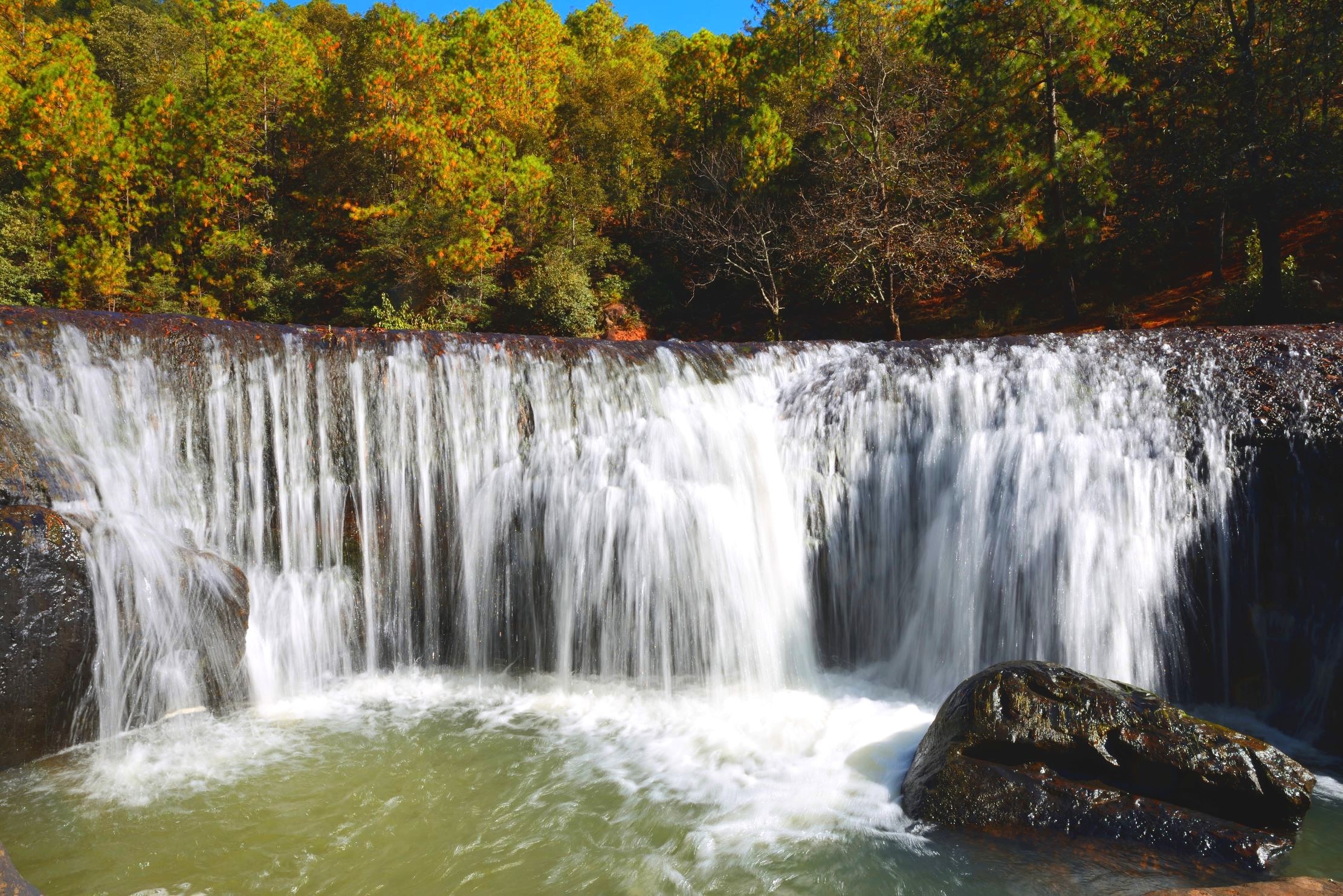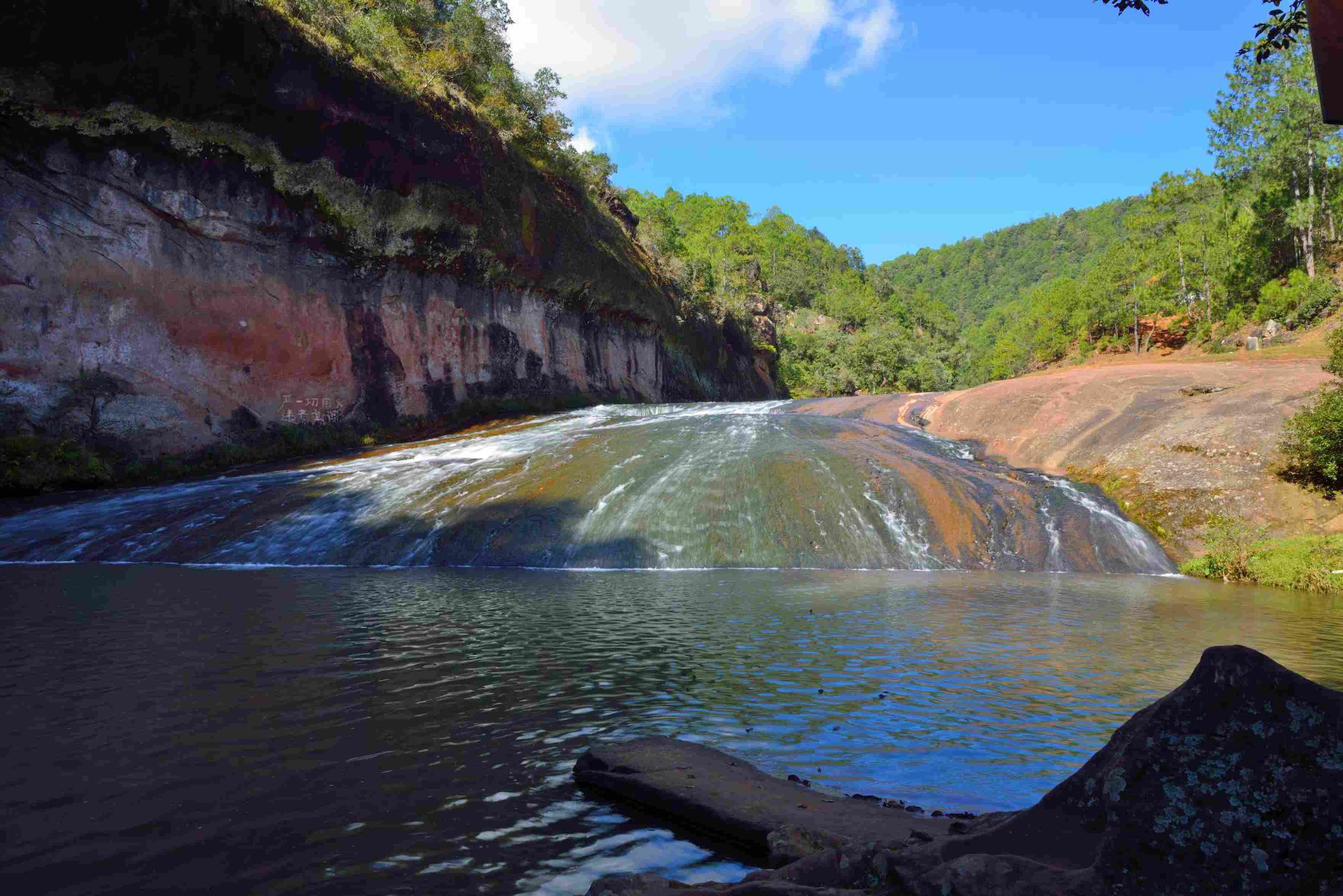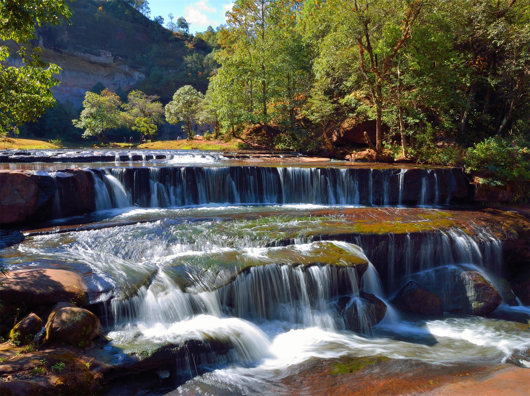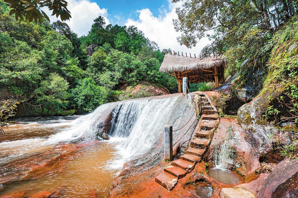 水城河位于武定县插甸镇水城村,流域范围内植被茂密,生态环境良好,当地人称水城河是“头戴绿草帽、中间石肚翘、脚下清泉流”的绝美山水风光旅游地。大自然的天工之作,造就了水城河数道不同类型的瀑布,河床两岸巨大奇特的红砂岩与原生植被交融一体,形成亮丽景观。清澈的河水在宽阔而坚硬的河床上静静地流淌,既有高原湖泊的明净,也有深谷飞瀑的壮美。沿着水城河一路前行,便能邂逅绝美的山水画卷,有溪流瀑布欢唱,高原平湖静思,云雾高山缠绕,巨石险壑耸立,深谷村落悠然。图为水城河瀑布。盛高义 摄