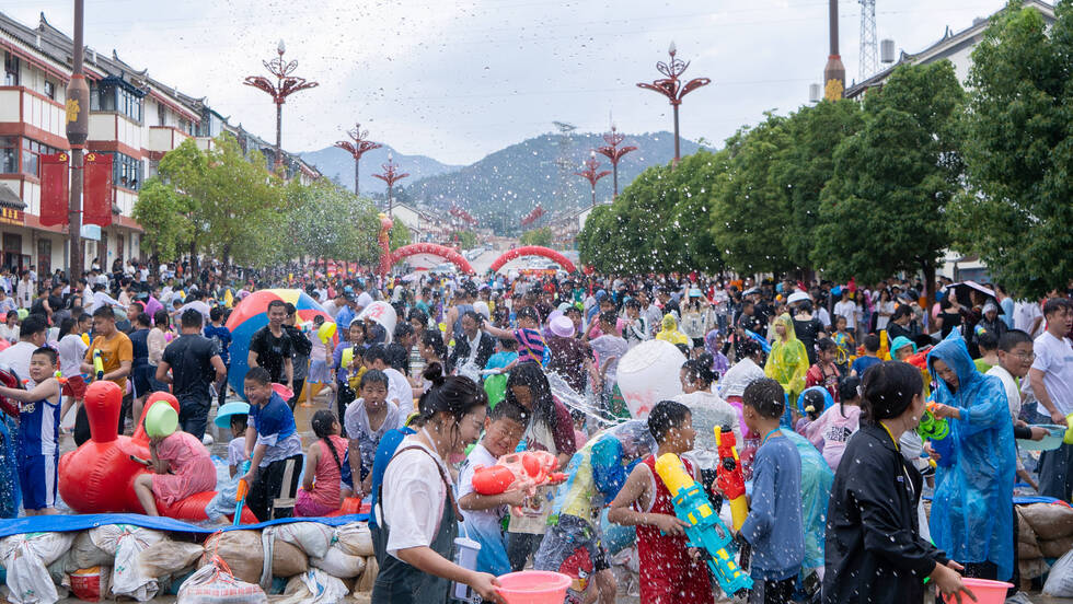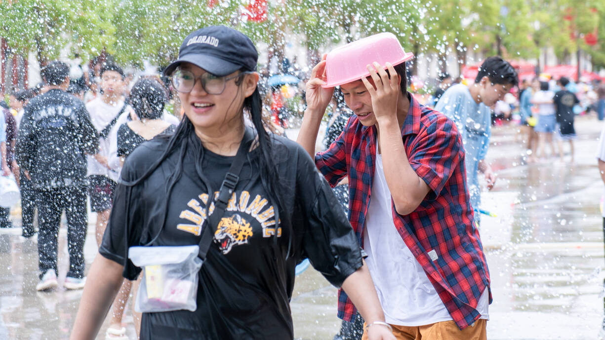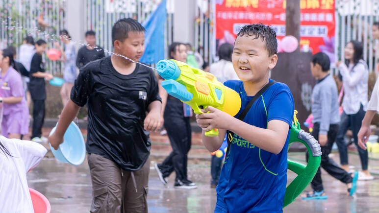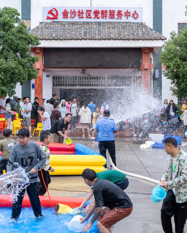 5月12日,狮山镇金沙社区水花飞舞、激情似火,来自四面八方的游客与社区群众一起,相互泼洒吉祥、幸福之水,表达美好祝福和期望。