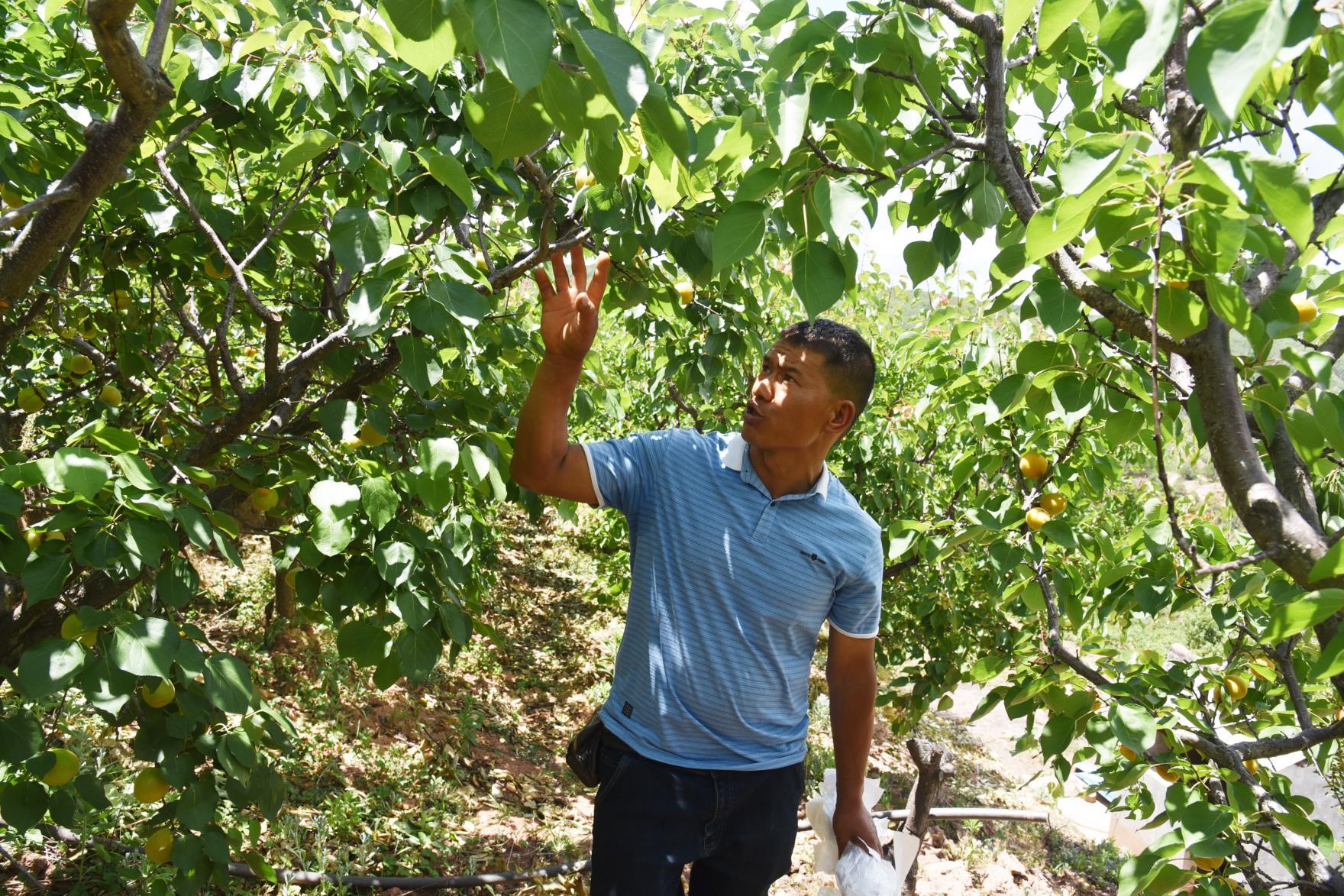 如今,李鹏忠在承包的山上除了种植400多亩杏子,还分别种了核桃、李子、桃子等果树,果林里养鸡、鹅等家禽,荒山披上绿衣变成金山银山,成为春季赏花、夏秋摘果的花果山。行走在山间小路上,闻着杏子香甜的味道,让人真切感受到丰收的气息。脱贫户李会芳拿着袋子正在杏树下卸果,她边摘边说:“我家就在山下村子里面住,来基地摘果子一天能挣80块钱还管饭。我也得好好干,明年也准备种植果树,好早点致富。”