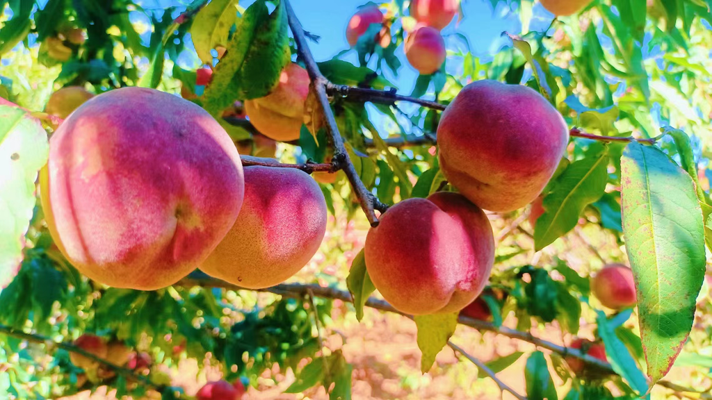 满山的桃园里,桃叶还郁郁葱葱,桃香却阵阵扑鼻而来,健壮的桃树上,一个个粉红的冬桃缀满枝头,农户和游客在桃园里来回穿梭,忙着采摘果子,忙着拍视频,发抖音,一派繁忙丰收的景象。放眼望去,满山桃树上的桃子粉红粉红的,成熟的冬桃你不让我,我不让你地挤挂在枝头,还有一些害羞的躲藏在茂密的枝叶间,煞是诱人。漫步在桃园里,处处可闻甜蜜的果香,随手一摘,便是一个比拳头还大的冬桃,咬上一口,汁多味浓,清脆甘甜,让人完全停不下来。
