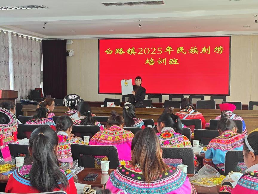 近日,白路镇协同武定绣娘坊举办2025年“飞针走线织锦绣,指尖技艺促增收”彝绣技能培训班,百余名绣娘踊跃参与,在针飞线舞中提升技艺,不断夯实白路彝绣产业发展根基。本次培训特别邀请到两位资深老师前来授课,采用理论与实践结合的方式,涵盖课堂教学、示范讲解、现场操作和作品展览等,为绣娘提供纹样绘图、色彩搭配、针法技巧等技能培训,并现场进行实践操作,手把手传授技巧,争取让绣娘在最短时间掌握刺绣基本技能。