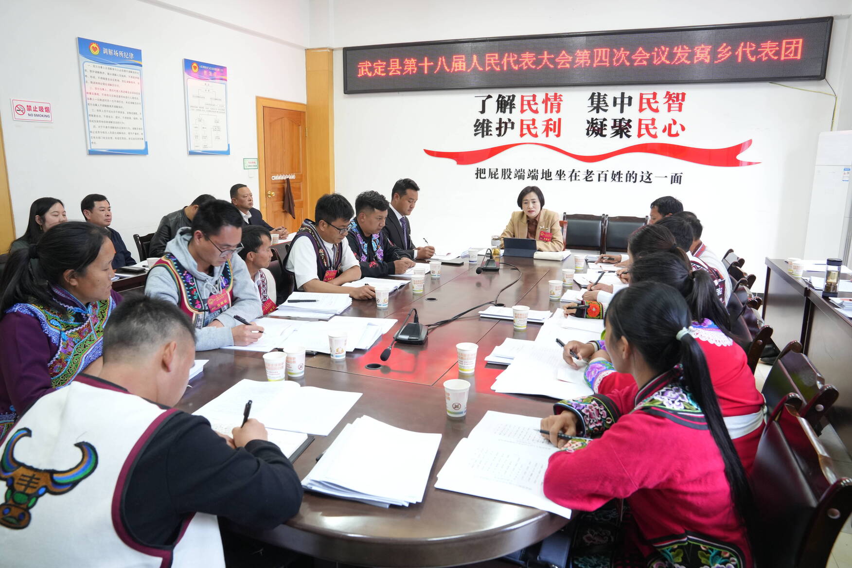 2月21日,县委副书记、县长沈海燕来到县十八届人大四次会议发窝乡代表团,与代表和列席人员等一起审议政府工作报告,审查计划、财政报告。