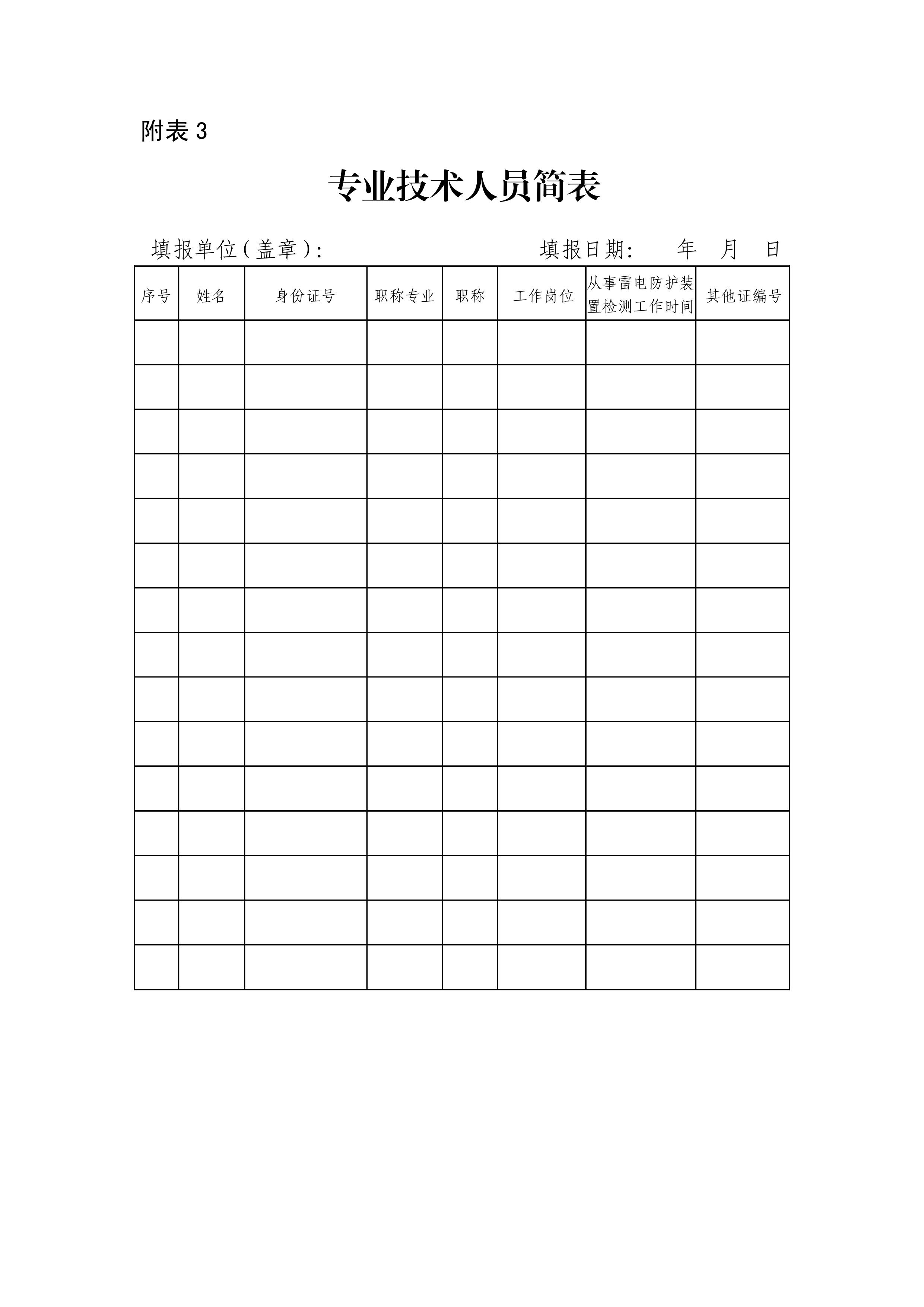 (二)《专业技术人员简表》(附表 3),具备雷电防护装置检测能力的专业技术人员技术职称证书、身份证明、劳动合同;